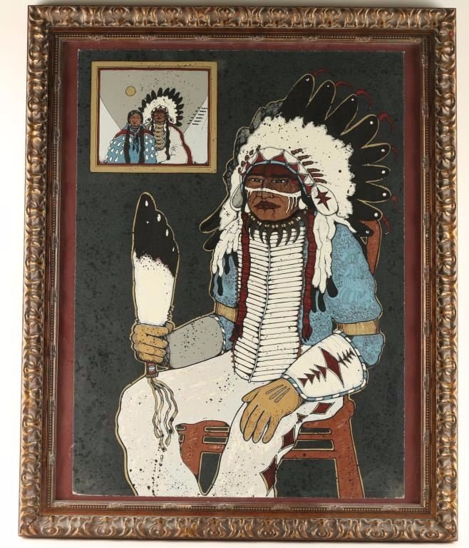 "Mad Dog with Fan" by Kevin Red Star, signed lower right corner. Image measures 22"x30 1/2" in ornate wooden frame. Kevin Red Star was born on the Crow Indian Reservation in Lodge Grass, Montana. He was raised in a family that values art and culture, where he developed an early love of drawing and music. HIs works are found in the CM Russell and Heard Museums, the Smithsonian Institution and scores of others. Pursuing a successful career spanning four decades, over 100 large scale exhibitions have featured the celebrated artist’s works on canvas and paper.
