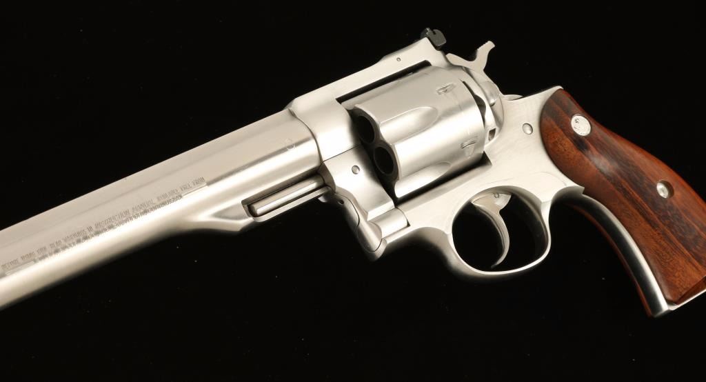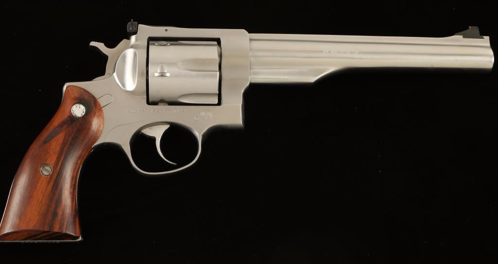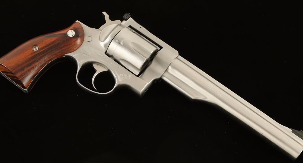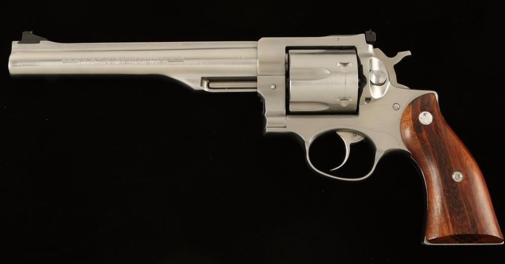 Stainless steel double action revolver chambered in .44 Magnum, circa 1984. Features a satin finish, heavy 7.5" ribbed barrel, blade front sight with gold bead, adjustable rear window sight, fluted six shot cylinder, smooth trigger, checkered hammer spur, transfer bar safety, and smooth Ruger medallion two piece wood grips. Revolver show excessive cleaning on the frame giving it a brushed appearance, also seen near the muzzle on the left side of the barrel. Action is smooth, bore is bright, and grips are very good with dents & rounded edges. Condition is very good. ***Modern Firearm***