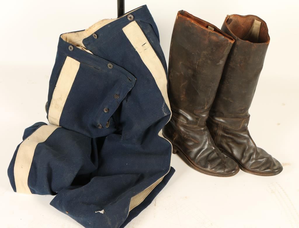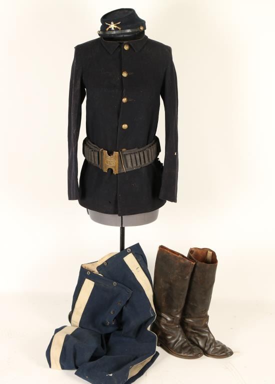 Includes blue wool coat with 5 brass eagle buttons, leather boots, coat pants-wool pants with white stripes on the sides, a Mill's belt with US buckle, and a Kepi hat which needs restoration of bill. Coat shows scattered losses and holes. In fair condition for age.