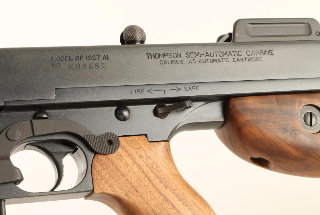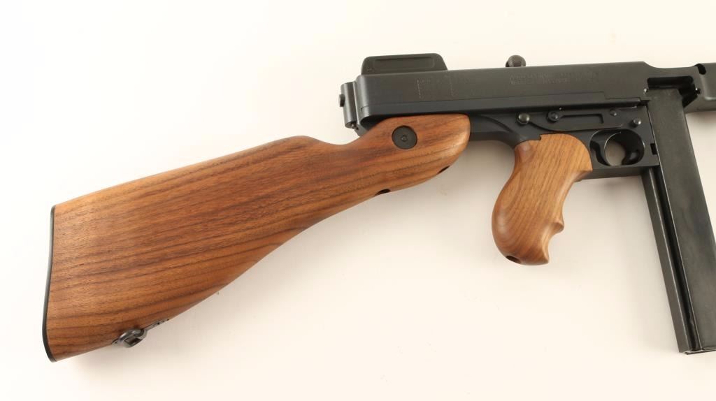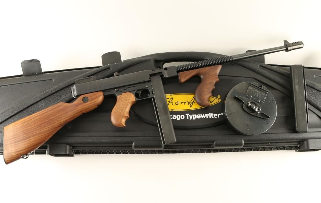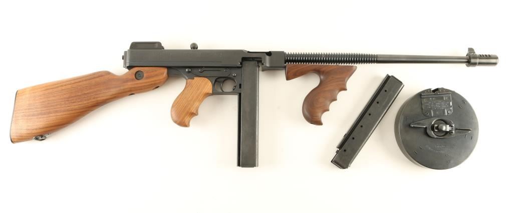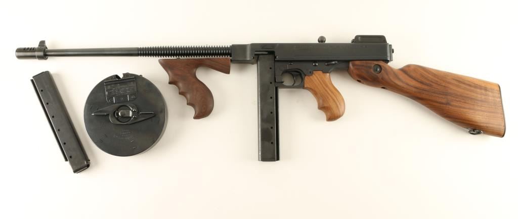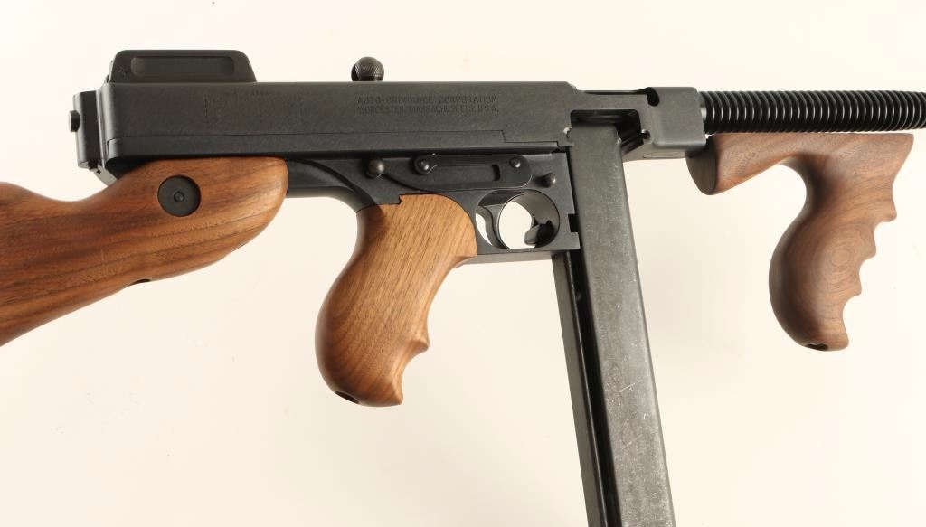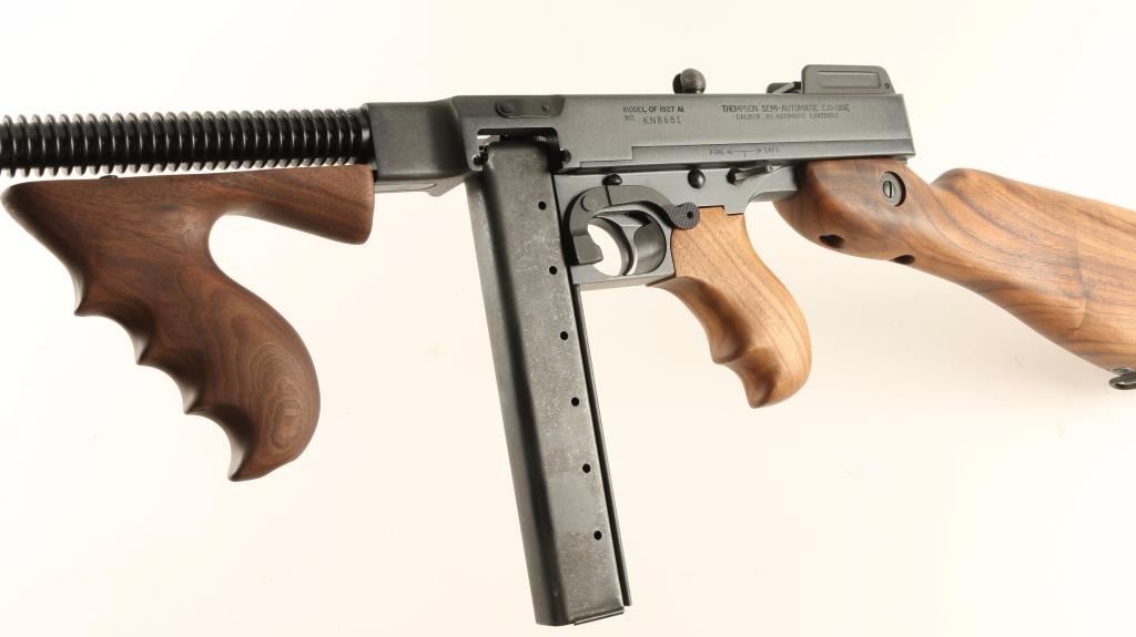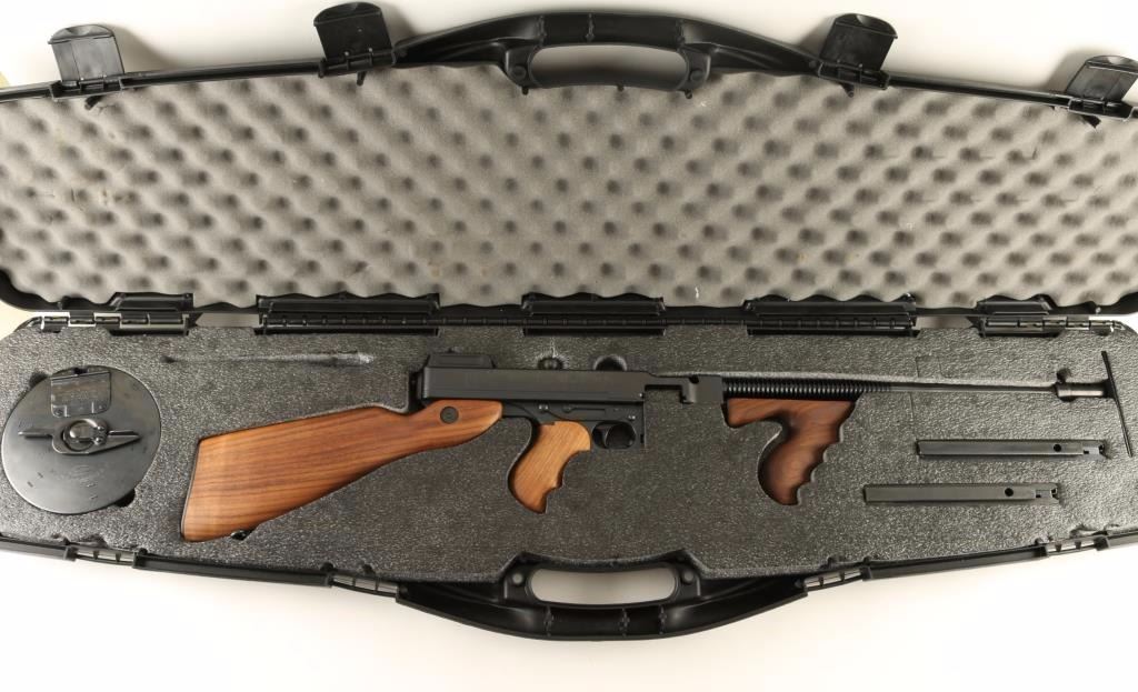 'Deluxe' Recently manufactured semi automatic rifle modeled after the iconic 'Tommy Gun', chambered in .45 Automatic Colt Pistol. Features a blued finish, 16.5" finned barrel with compensator, blade front sight, adjustable flip-up rear sight, checkered charging handle, manual safety, steel receiver, smooth trigger, American walnut vertical foregrip, pistol grip and shoulder stock with sling swivel & metal buttplate. Includes a factory hard case with fitted inserts, two 30 round stick magazines, one 50 round drum magazine and lock. Rifle shows little to no wear. Action is strong, bore is pristine and woos stocks are fine. Condition is like new in case. ***Modern Firearm***