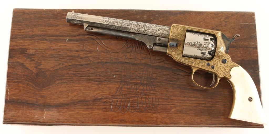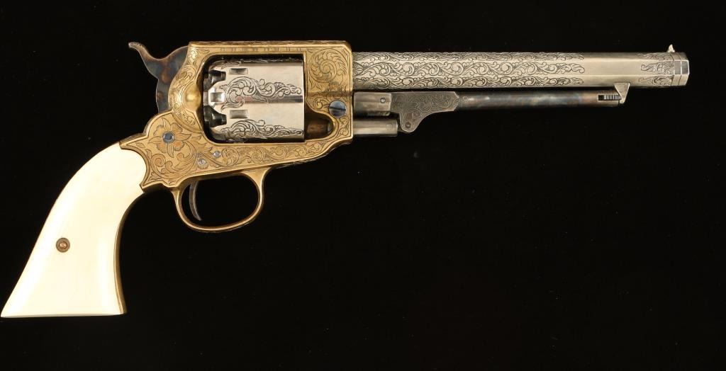 Engraved modern reproduction of the scarce Spiller & Burr confederate single action percussion revolver in .36 caliber. Features full floral engraving by Don Makarov(signed under grips), Ivory grips by C. M. Bates(singed on back), 7" nickel plated octagonal barrel, cone front sight, notched rear sight, loading lever, non-fluted nickel plated six shot cylinder, case hardened hammer with checkered spur and brass frame. Includes a partitioned wood case with red velvet lining and components for a lock. Revolvers exhibits 95% of it's nickel finish with few losses and it's case colors are vivid. Action is smooth, bore is excellent and grips are fine with few small hairline cracks. Condition is near excellent. ***Antique Firearm***