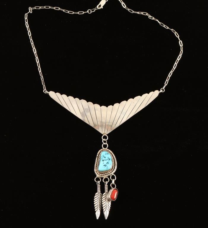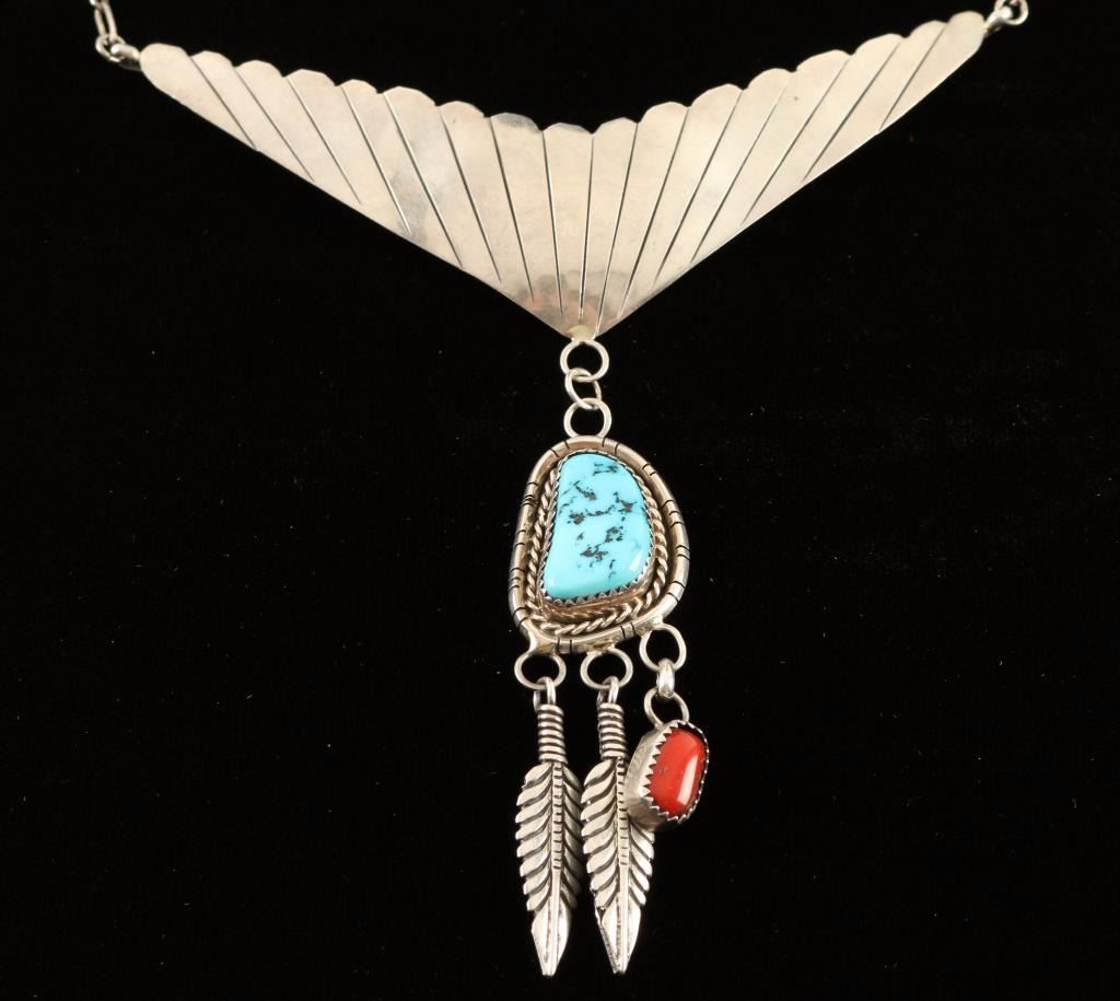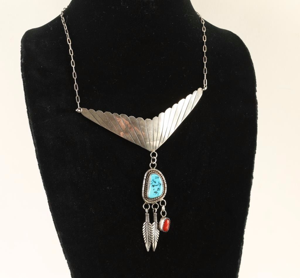 Sterling silver choker type necklace with a Kingman turquoise pendant accented with dangling sterling silver feathers and coral cab.