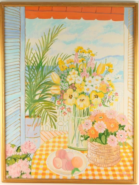 by Jamaican artist Lloyd Van Pitterson. Depicting a bright and colorful still life of flowers and fruit. Image size 39 1/2" X30". Signed lower right hand corner. Bio information- Lloyd van Pitterson was born in Jamaica West Indies. After working in the rum industry for twenty-two years, and practicing art as a Sunday painter, he finally devoted himself, in 1965, to a full time artistic pursuit. He studied art with Edna Manley, the leading West Indian sculptress, and was a student of Joe Locke, an English Impressionistic painter.Van-Pitterson studied printmaking (the lithographic portion) in several areas of the U.S.A. and serigraphy with Jules Andres of Futura Screens in New Jersey. Van-Pitterson taught art at Central Branch School in Jamaica, and created murals for Holiday Inn and the Olympia Hotel, Jamaica. He directed his own art gallery in Jamaica The Art Scene) before moving to the United States to live. His style is flexible, and ranges from sunny post-Impressionistic studies of balconies or windows opening onto the sea, to market scenes bustling with tropical activity, to landscapes and bold non-objective collages. All of his works share a bold approach to composition and sensitivity to color.Van-Pitterson has had 33 one man shows in Jamaica, Trinidad, West Germany, Canada and the United States, and has had numerous group shows around the world.