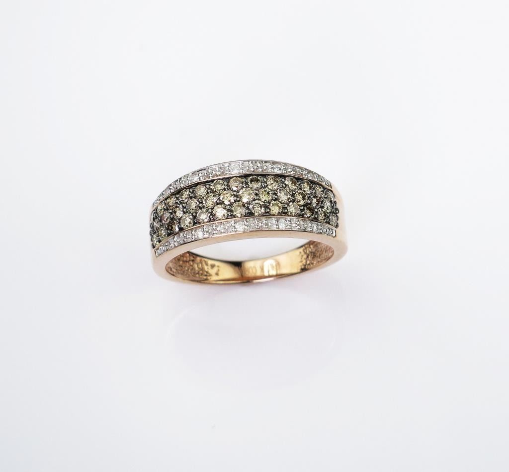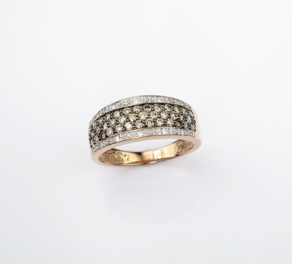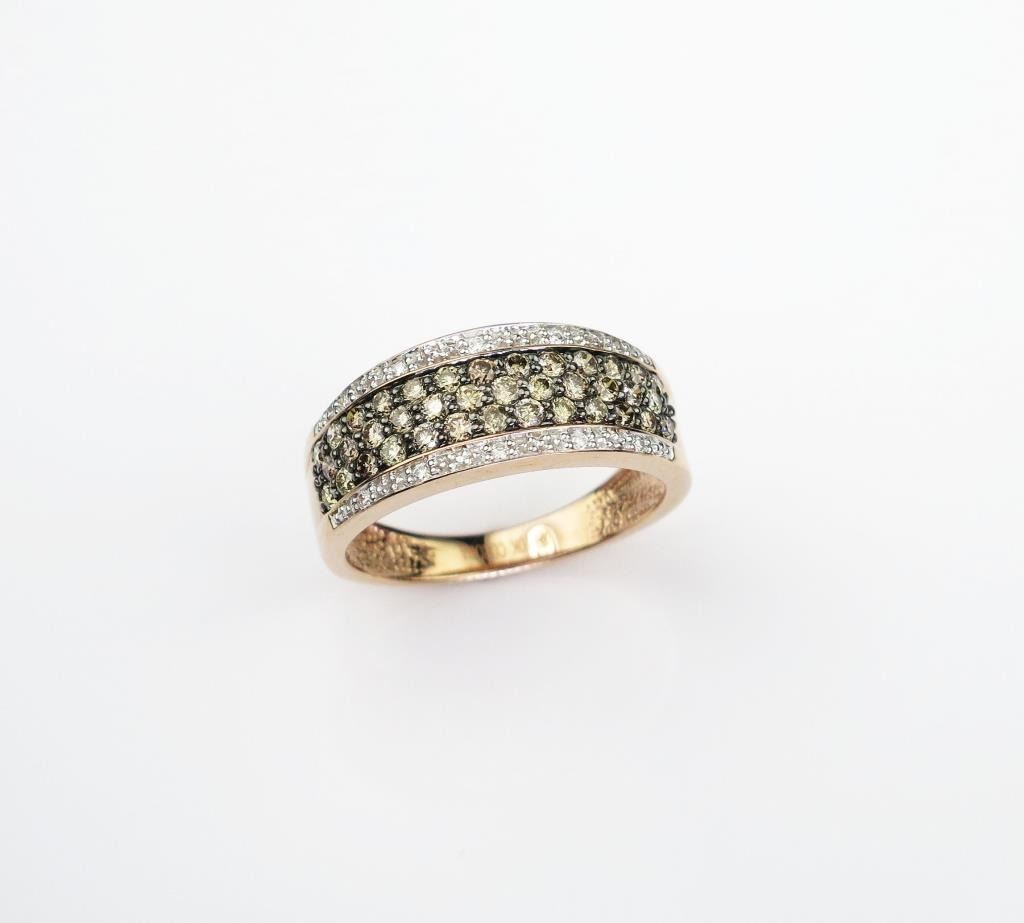 Hallmarked 'CORONA' micro set with over 50 round chocolate and white Diamonds weighing approx 1.00 carat set in a 10 karat rose gold setting.