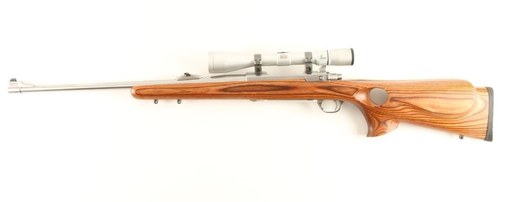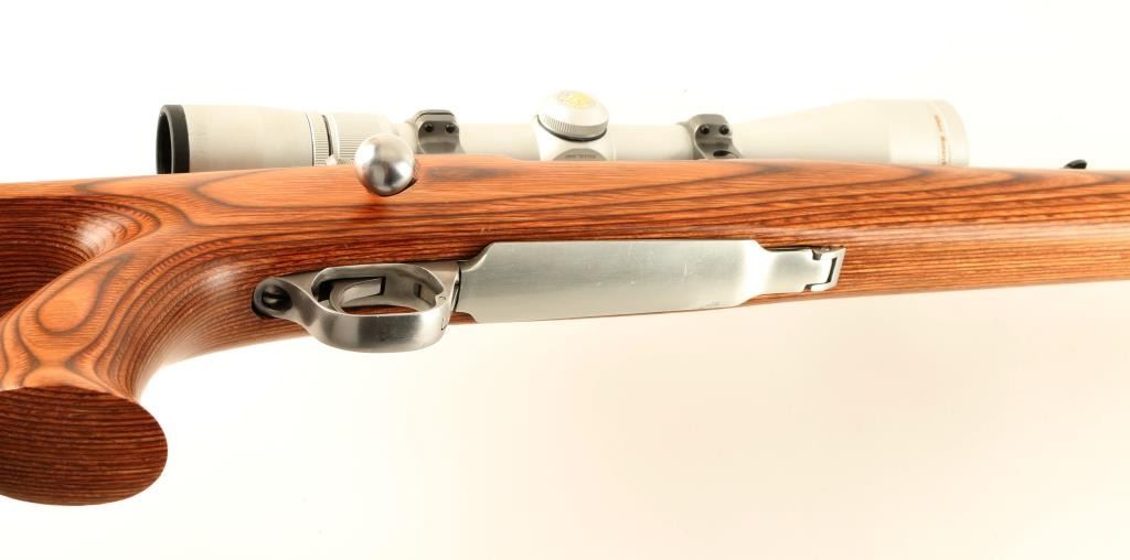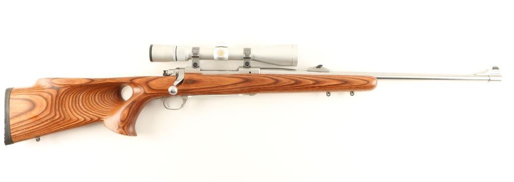 Stainless steel bolt action sporting rifle chambered in .30-06 Springfield. Features a brushed finish, 22" tapered barrel, raised blade front sight with brass bead, adjustable folding leaf rear sight, Nikon 3-9x scope, polished bolt, internal box magazine, smooth trigger, swivel studs and brown laminated wood thumb hole pistol grip shoulder stock with rubber recoil pad. Rifle shows minimal wear. Action is smooth, bore is excellent and wood stock is fine. Condition is near excellent. ***Modern Firearm***