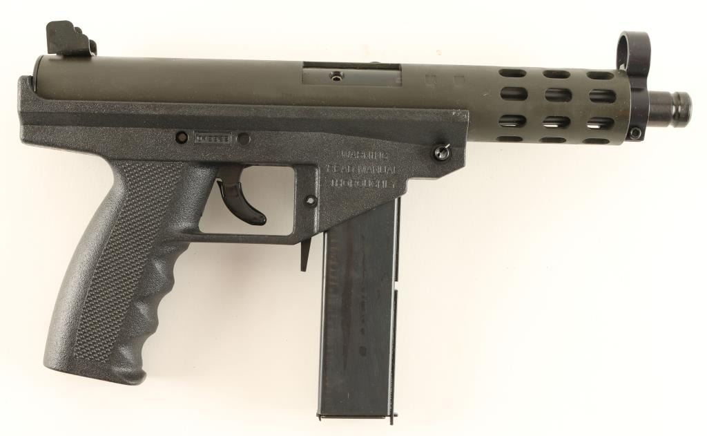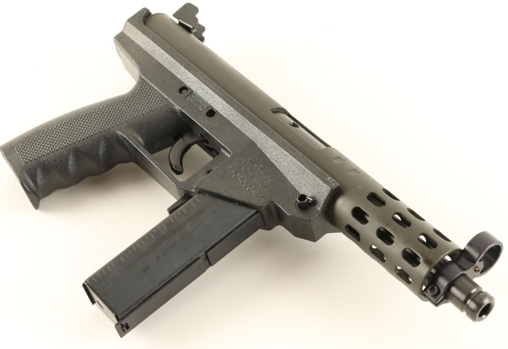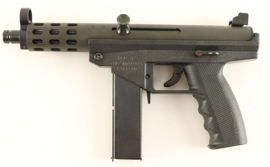 Semi automatic Intratec KG-9 clone chambered in 9mm, circa 1980's - 1990's. Features a matte black finish, 5" shrouded barrel, open sights, black synthetic frame, manual safety, rubber covered trigger, 20 round magazine and large round charging handle. Includes original box with documents. Pistol shows very little wear. Action is strong, bore is bright and frame is excellent. Condition is near new in box. ***Modern Firearm***