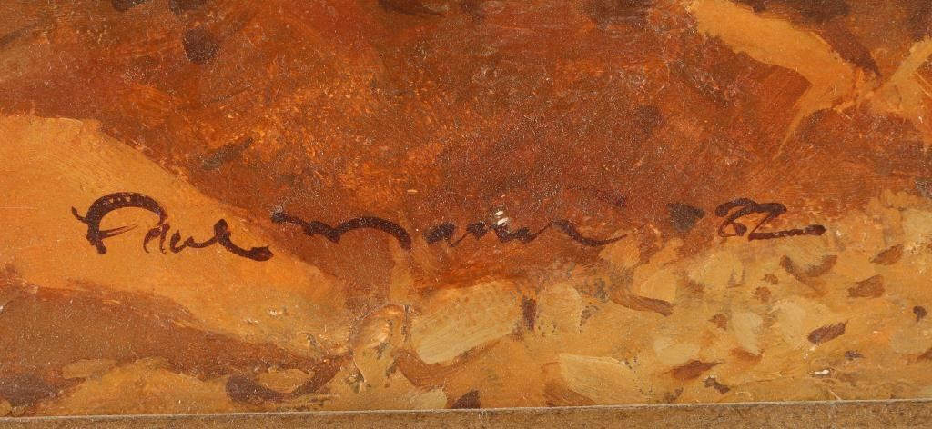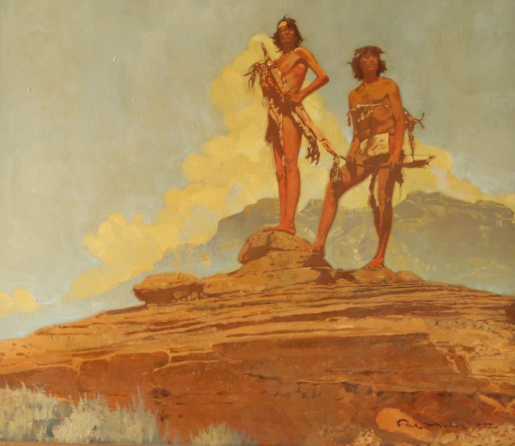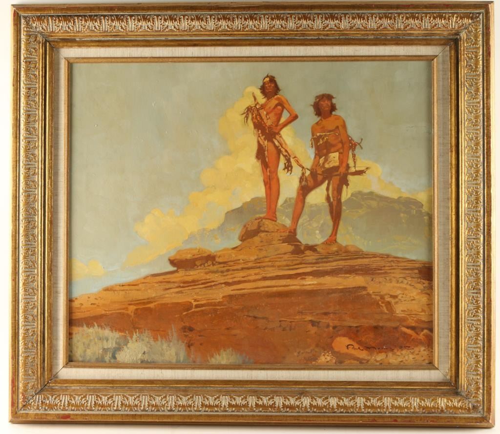 Paul Mann artist, hand signed and dated 1982. Depicting two Indian warriors on rock in gold gilt frame. Image size 24"x19". Paul Mann is an artist who grew up loving the old West and continues his love of this time period by devoting himself to bringing the authentic wild west to his canvases. Mann has always been interested in art. Even as a young boy he knew that he loved creating pictures. Coming from a family that valued art, he found acceptance and support for his work. His father was a photojournalist and painted as a hobby, and his older brother is also an artist. As a high-school student, Mann gained recognition when he was presented the Award of Merit from the Society of Illustrators Show in New York City. Additionally, he was a participant in a summer workshop at Utah State University working with some of the top illustrators of the time. After attending Utah State University and serving a two year mission, he was faced with a difficult choice: return to Utah State to complete his degree or accept a job offer in the field of illustration. Mann chose to follow his avid interest in illustration. He says, "I love the Golden Age of Illustration, especially art produced during the 50's and the 60's. I have always felt the caliber of art and artist during this time period were the best in illustration such as artists like Tom Lovell, Frank McCarthy, Howard Terpning and Robert McGinnis. I studied their techniques and learned everything I could from them." Although he was engaged primarily in illustration field, he did show western paintings in several galleries where he gained a reputation for his art. In addition to doing extensive research into Indian life and lifestyles, Mann collected costumes and handmade clothing, adornments and implements. He worked from life with models that he discovered. Eventually, it was time for him to make another life-altering decision: continue to pursue a career in illustration or re-establish himself in the area of fine art, concentrating on western art and seeking new representation in galleries. This time, he chose to paint for the galleries. He feels that this is where he wants to be and should be at this point in his career. "I love the art of building a picture, the design, color and value. I love the use of drama and strong lighting with a great story. I continue to relish the research and making and collecting clothing from the 1800's."