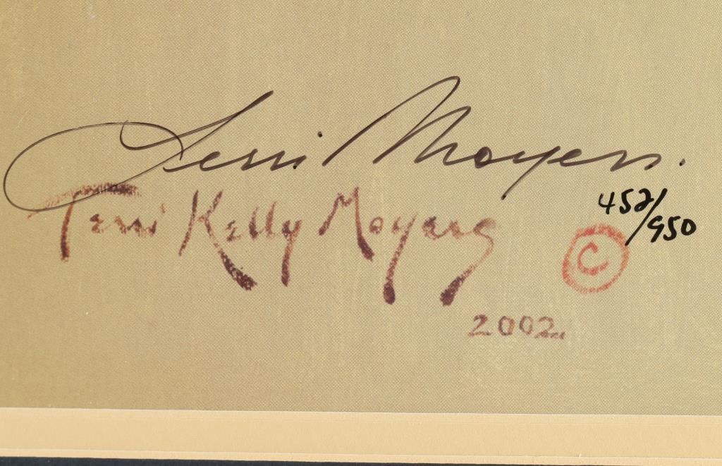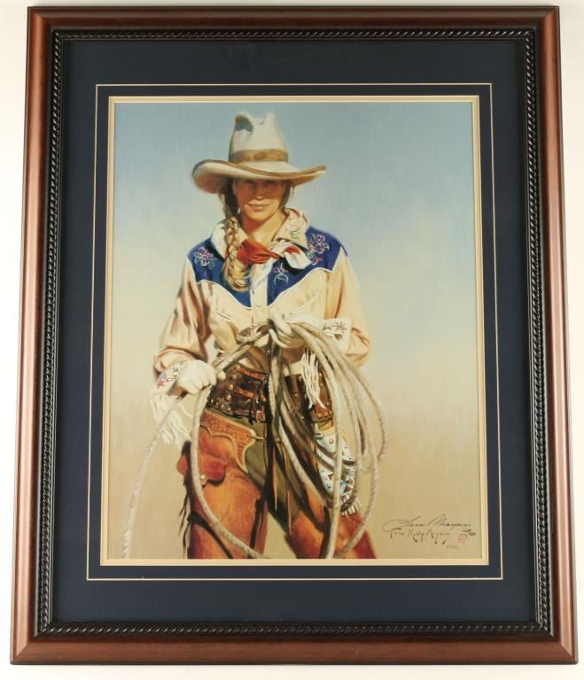 Terri Kelly Moyers artist. 452/950 hand signed in ink lower right entitled "With Attitude" depicting cowgirl. Includes certificate of authenticity on back. Double mat and frame, Measures 24"x19" Canadian artist from Alberta, Canada who studied under Robert Lougheed. In 1996 she won the Frederic Remington Award at the National Cowboy Hall of Fame in Oklahoma City and has earned the Norma Hulsey Award. Currently lives in NM and is a member of the Cowboy Artists of America.