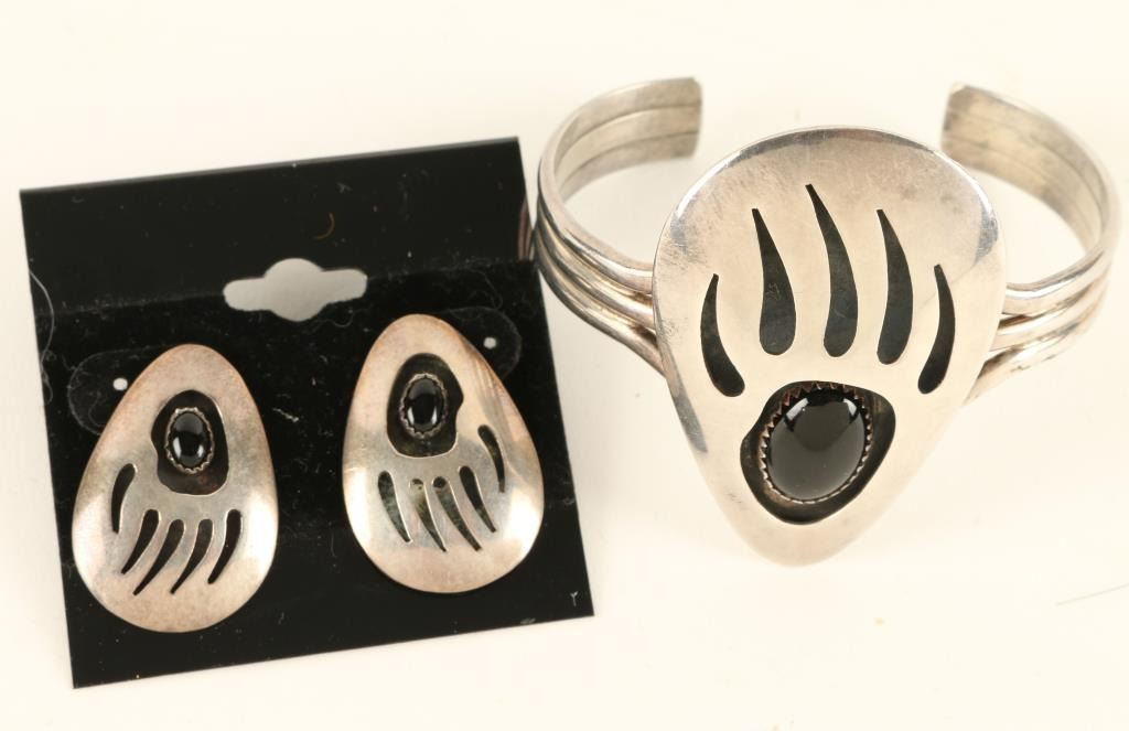 Jewelry Pieces. All with the Navajo initials 'TN' of Thomas Nez. A 'Bear Claw' unique bracelet with a black onyx gem mounted on top and a pair of matching 'Bear Claw' sterling silver earrings, each with a black onyx gem mounted on the front to compliment the 'Bear Claw' bracelet.