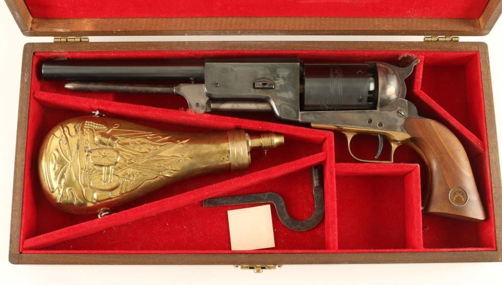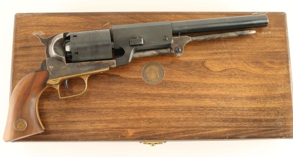 Italian made copy of the Colt 1847 Walker single action percussion revolver in .44 Cal, commissioned by the Dallas Arms Collectors Association. Features a blued & case hardened finish, 9" part octagonal barrel, blade front sight, notched rear sight on hammer, loading lever, case hardened frame, non-fluted six shot cylinder with etched DACA logo, brass square back trigger guard, checkered hammer spur and one piece smooth wood grip with DACA medallions. Includes a partitioned wood locking display case with large DACA medallion on the top, red velvet lined interior, nipple wrench and powder flask. Revolver exhibits approximately 90% finish with losses on the left side of the frame. Action is smooth, bore is excellent and grips are fine. Condition is very good in case. ***Antique Firearm***