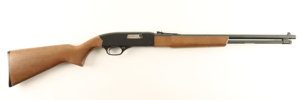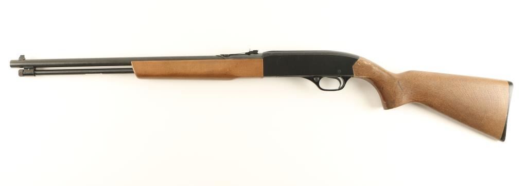 Tube fed semi-automatic sporting rifle chambered for .22 Long or Long Rifle. Features a black finish, 20" blued barrel, full tube magazine, blade front sight, adjustable rear sporting sight, push button safety, beveled trigger, alloy frame and two piece wood stock. Rifle shows moderate wear on receiver with scattered light surface rust on barrel & magazine tube. Action functions but needs a good cleaning, bore is very good and wood stocks are good with many small blemishes. Condition is near good. ***Modern Firearm***