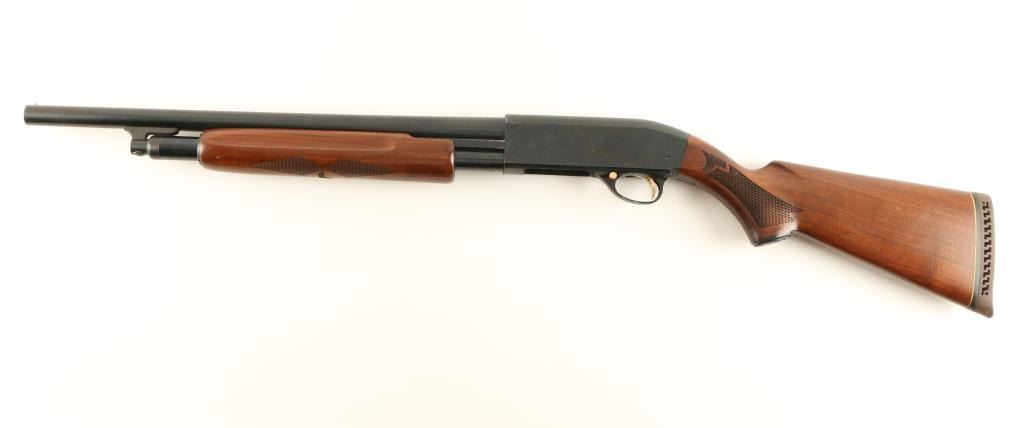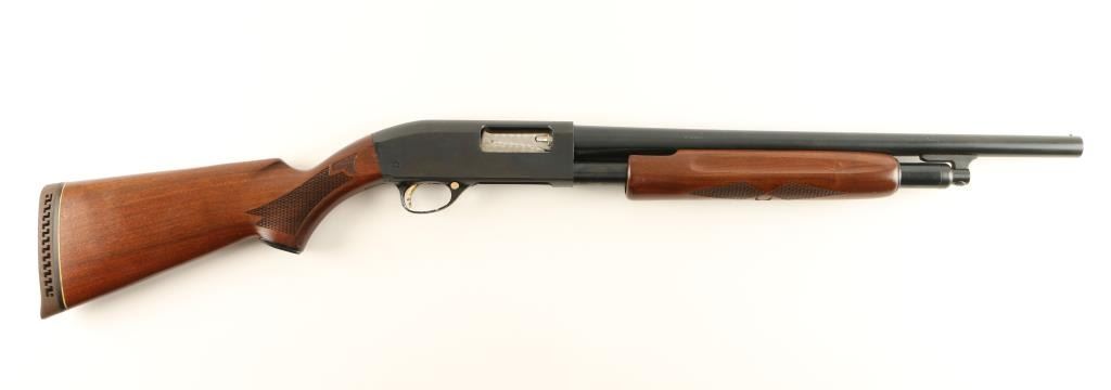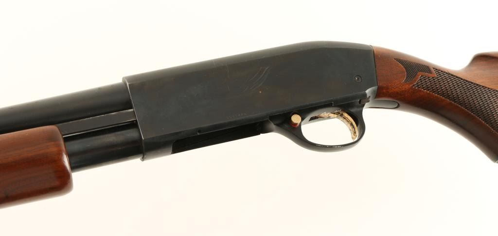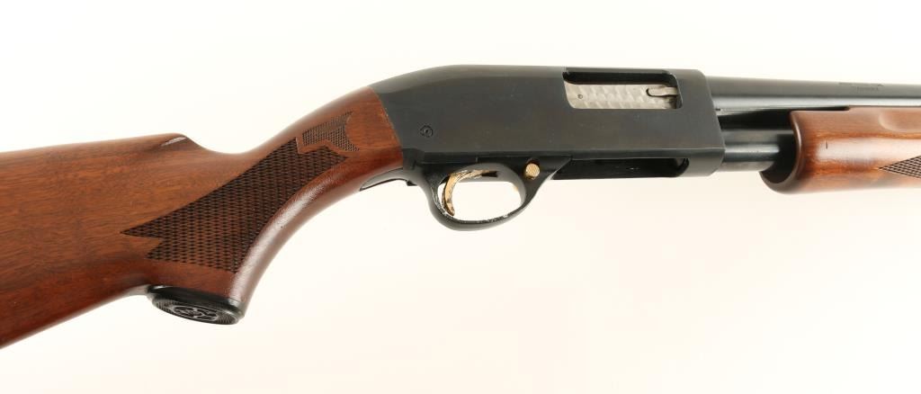 Tube fed slide action repeating shotgun chambered foe 2 3/4" 12 gauge shells. Features a blued finish, 20" barrel, bead front sight. 5 round tubular magazine, gold trigger & push button safety, jeweled bold, bottom ejection port, and checkered hardwood stocks with rubber recoil pad. Shotgun exhibits light scratches & minor losses with approximately 92% finish intact. Action is smooth, bore is bright and wood stocks are fine. Condition is very good+. ***Modern Firearm***
