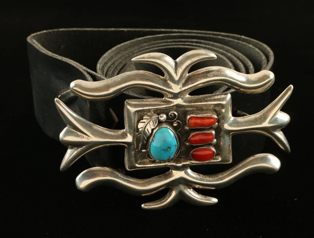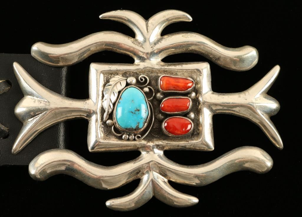 Accented with 3 Coral stones and 1 turquoise stone set in heavy sterling silver, on smooth black leather belt Fits 34/36.