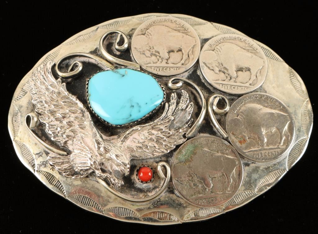 Featuring a raised embellishment of an approaching flying eagle beside a blue 'robins egg' turquoise stone and a small coral stone beneath it. Four vintage American Buffalo nickels complete the custom crafted design.
