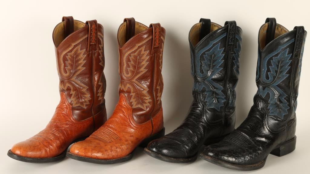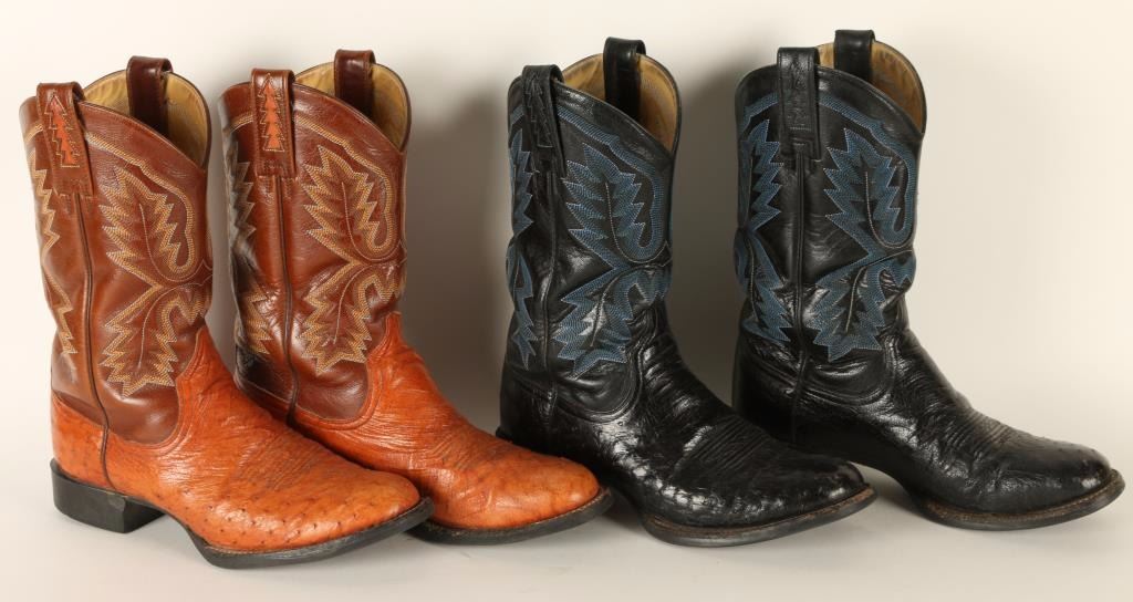 1 cognac ostrich and 1 black pair ostrich boots. Both are a size 8, lightly used condition.