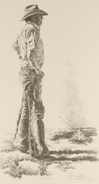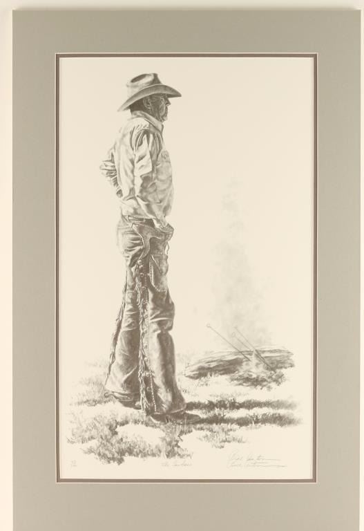 "The Cowboss" by noted Cowboy Artist Bill Anton depicting cowboy with chaps standing with hands on hips taking note of his surroundings. Image measures 14 3/8"x24". Numbered 77/100 signed lower right with double mat ready to frame. Bill Anton became a western painter, especially of the lifestyle of cowboys. He first traveled West at age seven. He attended Loyola University in Chicago and then transferred to Northern Arizona University in Flagstaff, Arizona, majoring in English. He settled in Arizona, and his wife, Peggy, supported him while he established his career as an artist. Bill Anton paints and draws today's working cowboy. Inspired by the work of Anders Zorn, Sorolla, Edgar Payne and Frank Tenney Johnson, Bill works from field studies whenever possible to achieve the vitality photos cannot match. Working primarily in oil, he can always be found in one of three places - the studio, a ranch or painting outdoors. Bill Anton's work is in corporate collections including those of Sears, Dupont, State Farm Insurance, Bank of America, Hewlett Packard and Trust Company of the West.