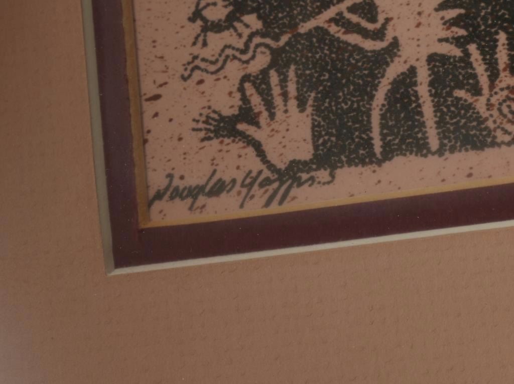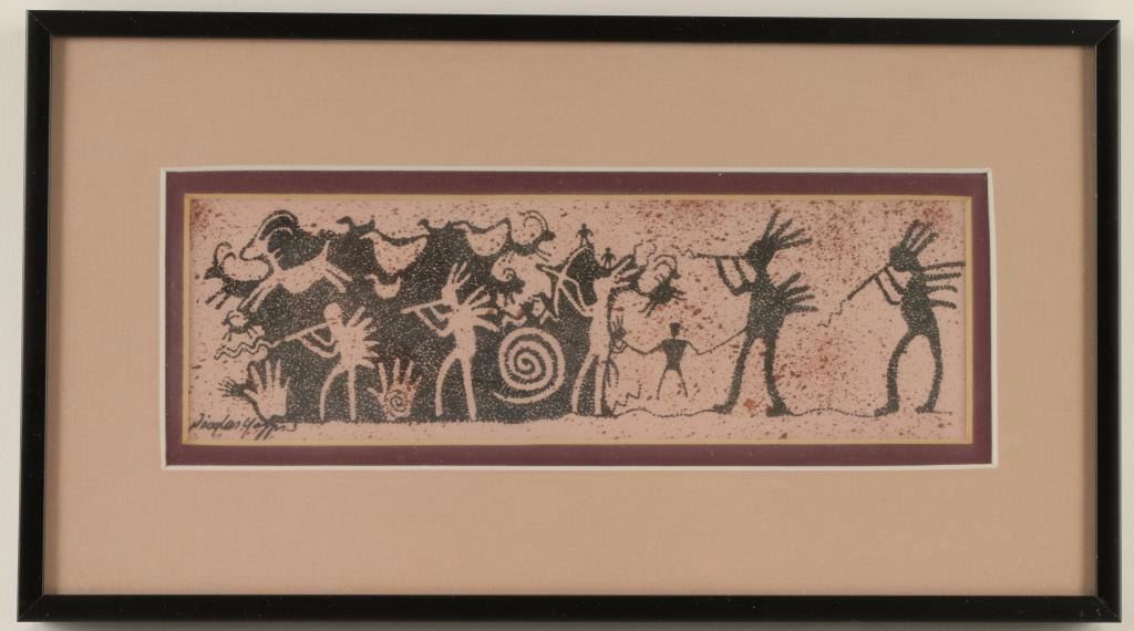 "Clinging to Life" signed lower left corner. Scene depicts Kokopelli, game animals, healing hand and other symbols. Double mat and black metal frame. Image measures 8"x2 1/2".