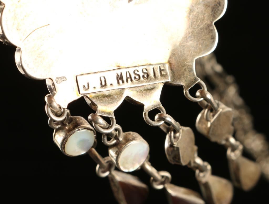 Handmade and signed by Zuni Artisan, J.D. Massie. This is an authentic Zuni Indian necklace expertly crafted and made of Sterling Silver, Coral, Onyx, Mother of Pearl, and Turquoise. Pristine excellent condition and very collectible.