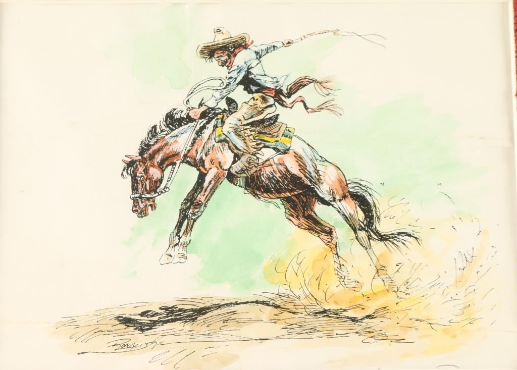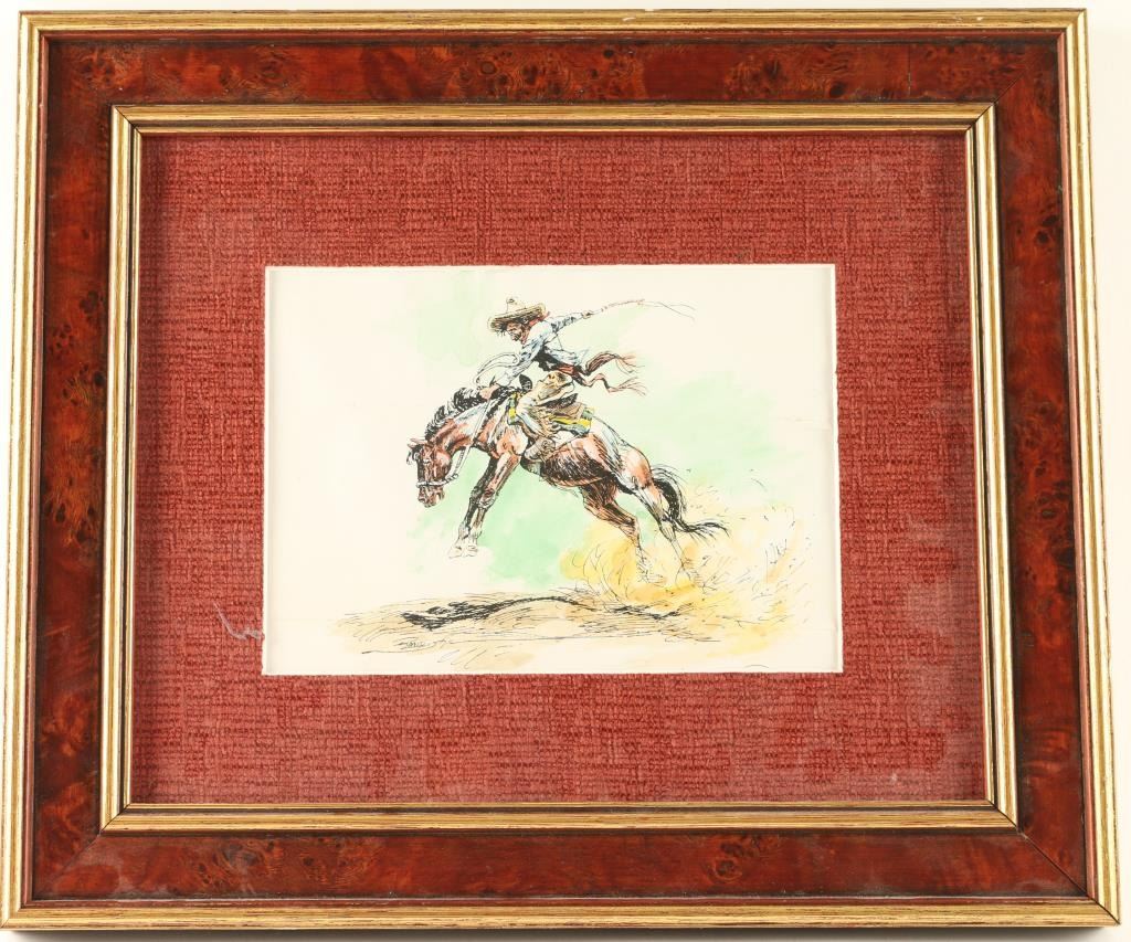 Depicting rider on a bucking bronc. Signed "Ronald K' lower left. Image measures 8"x5 1/2" with mat and wood frame with burled inset. Personal note from artist attached to back of picture.