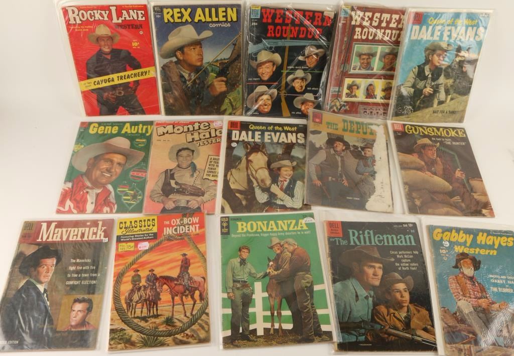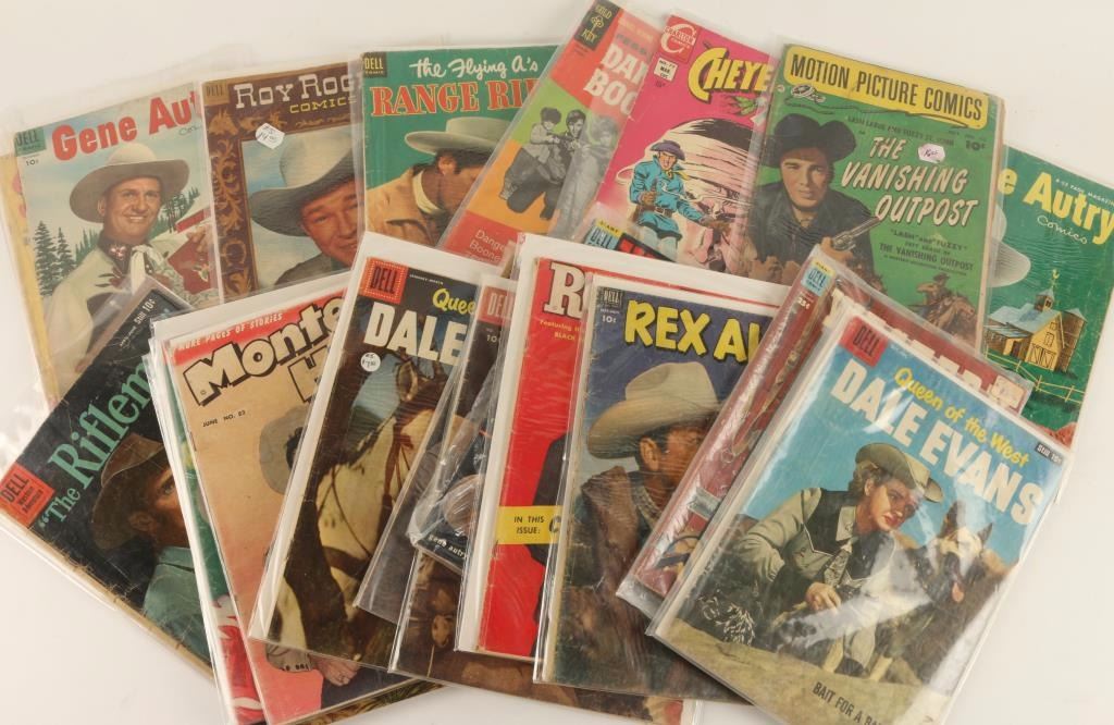 24 total featuring: Rex Allen, Rocky Lane, The Range Rider, Henry Fonda the Deputy, Fess Parker as Daniel Boone, The Lawman with John Russell and Peter Brown, Cheyenne Kid, Lash LaRue, Gabby Hayes, Gene Autry, Roy Rogers and many more! All comics in good preserved condition.