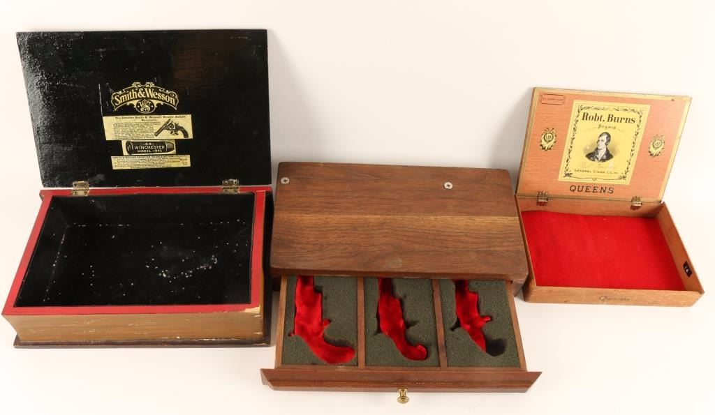 1 Single Drawer Box with inserts for three Derringers, 1 Large Book Style Shaped Box that is hollow for concealable objects, and 1 Robt. Burns Cigar Box that opens for concealment.