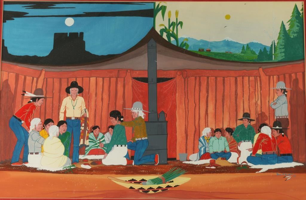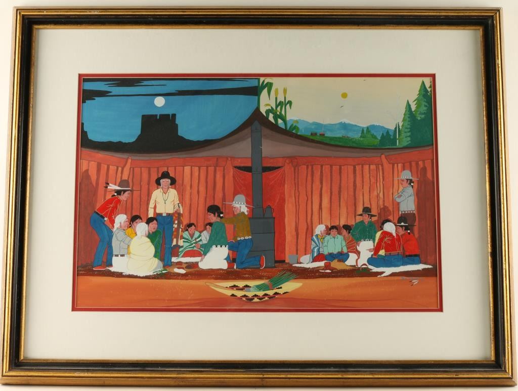 Depicting Southwest Indian ceremony in lodge. Image measures 22 3/4"x15": Double mat with wood frame.