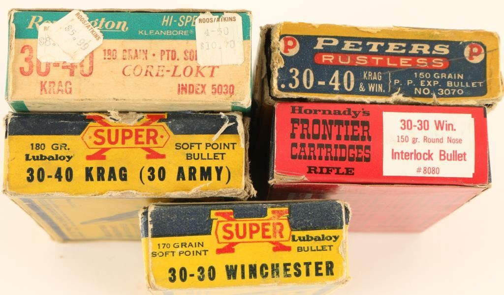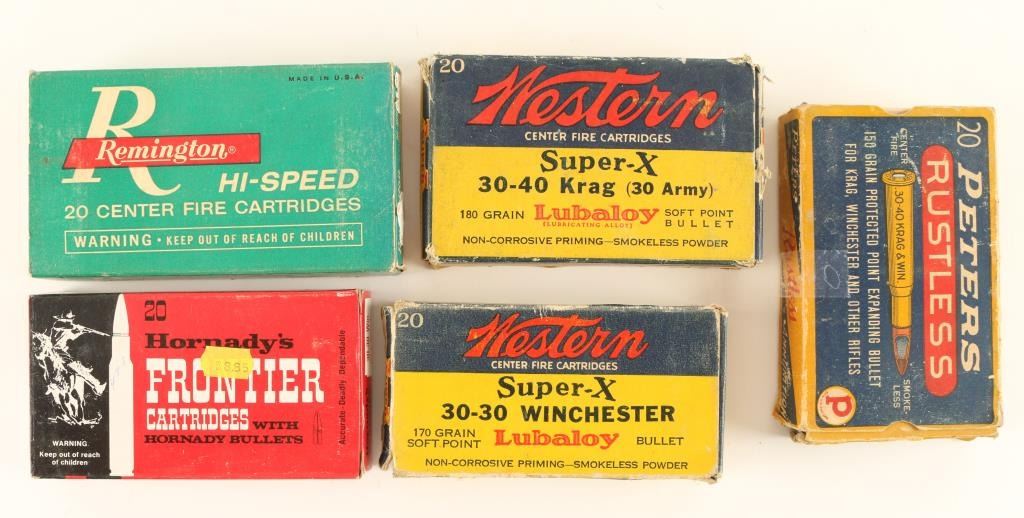 Including; Peters Rustless 30-40 Krag & Win 150 Gr-17 Rds, Western 30-30 Win 170 Gr-18 Rds, Hornady's Frontier 30-30 Win 150 Gr-20 Rds, Remington Hi Speed 30-40 Krag 180 Gr-20 Rds, and Western 30-40 Krag 180 Gr-20 Rds. All in original boxes.