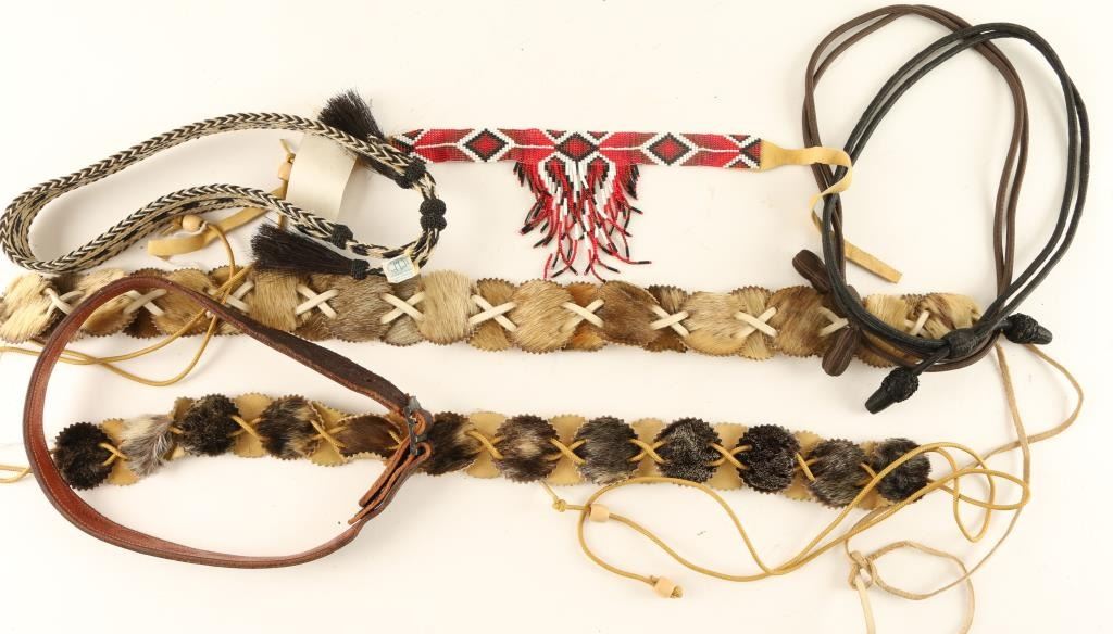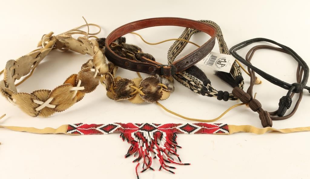Including; 1 tooled chocolate brown leather, 1 black & white braided horsehair, 2 fur hatbands, 2 cord bands with acorn tassels, and 1 red, black and white beaded choker.