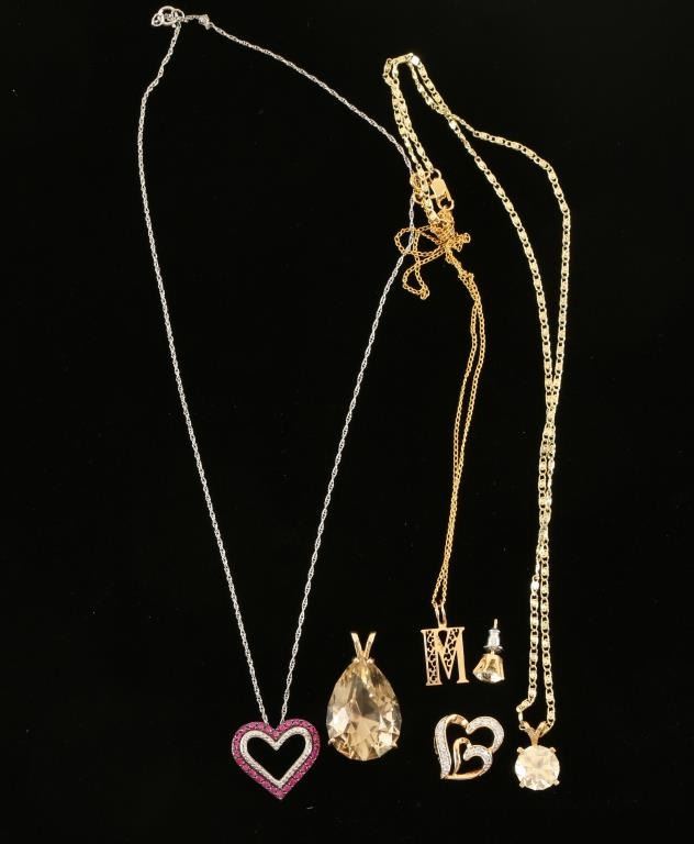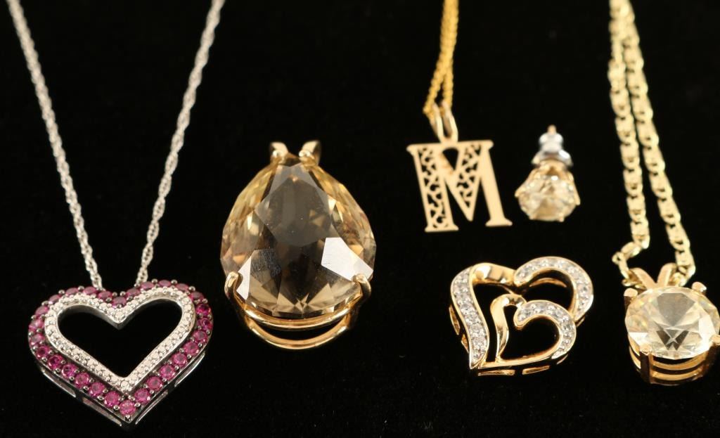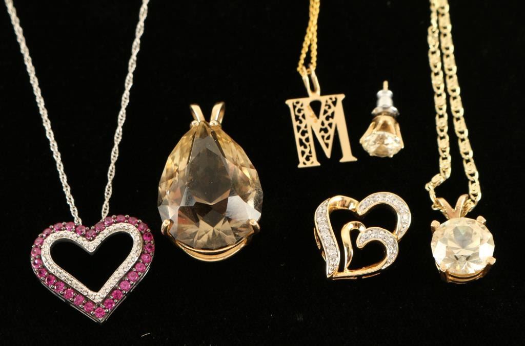 (1) Faux Diamond Necklace and earrings set (1) Pink Stone Heart Shaped Pendant (1) Champagne Colored stone set in 14KT could be smoky topaz? (1) Gold Colored "M" Pendant(1) Heart Pendant with faux diamonds.