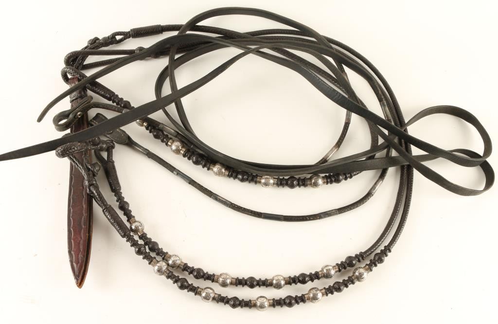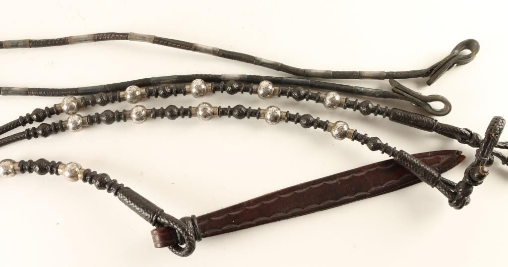 Including; braided pair of Romal reins with hand engraved floral sterling silver ferrels. Beautifully made. Also a pair of antique split reins with sterling ferrels-1930's era.