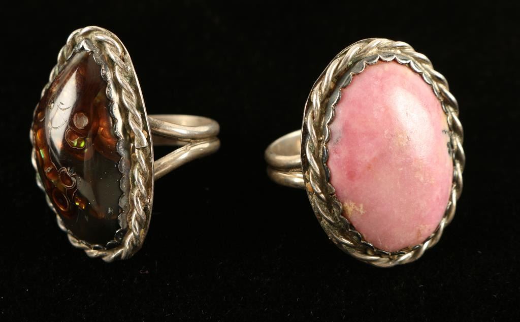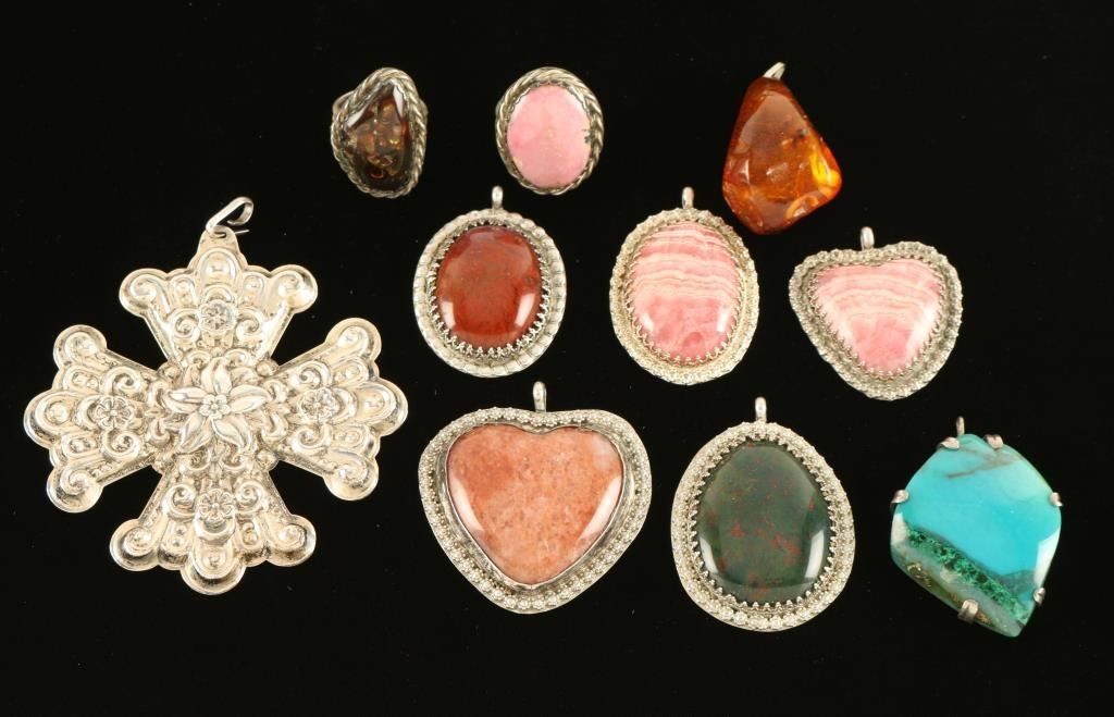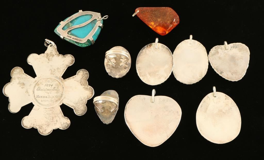 All are handmade stone set in silver colored metal, also a Amber Pendant, and a Reed & Baron 1974 sterling Christmas Ornament.