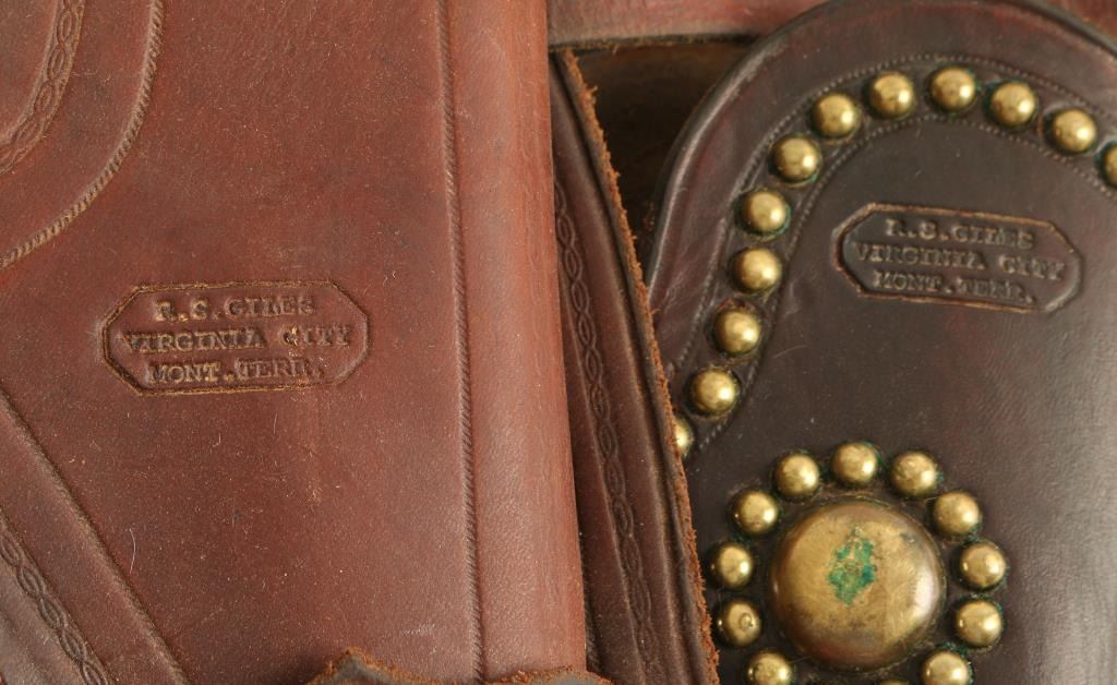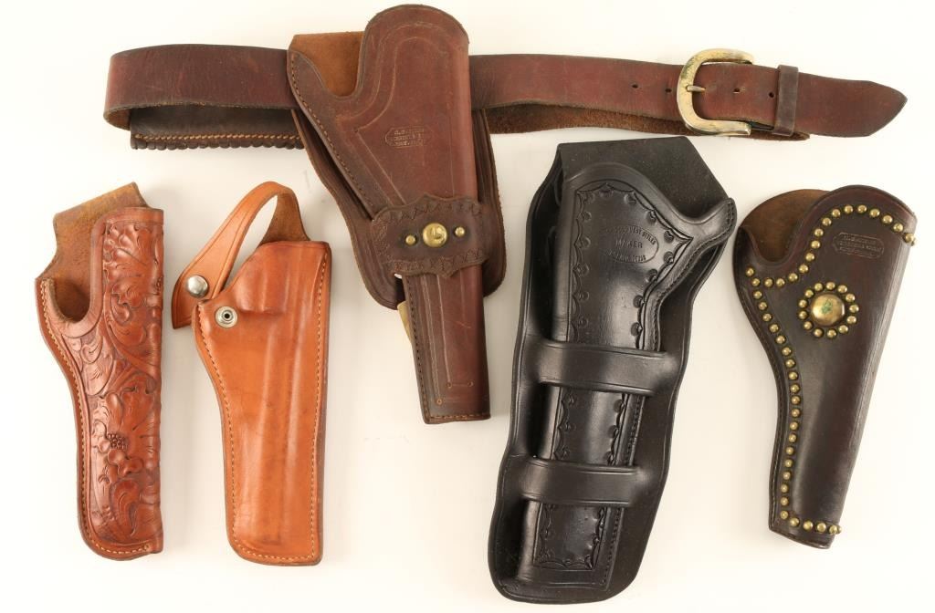 Including; 1 tooled brown Slim Jim holster, 1 smooth brown leather 'R.E.M. Industries K6', 1 smooth black leather with tooled scalloped edge 'Classic Old West Styles Maker El Paso, Texas', 1 smooth chocolate brown leather with spotted brass design 'R.S. Giles Virginia City Mont. Terr.', and 1 single rig smooth brown leather with large brass buckle also by 'R.S. Giles'.