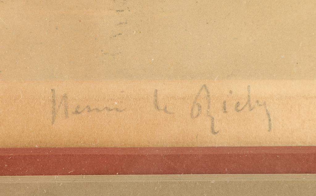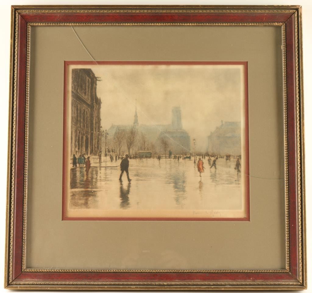 "Raining in Paris" by Ridi. Patrons walk through a busy square. Great reflective quality. Signed lower right corner, double mat and wood frame. Image measures 13 1/2" x 11 1/2".