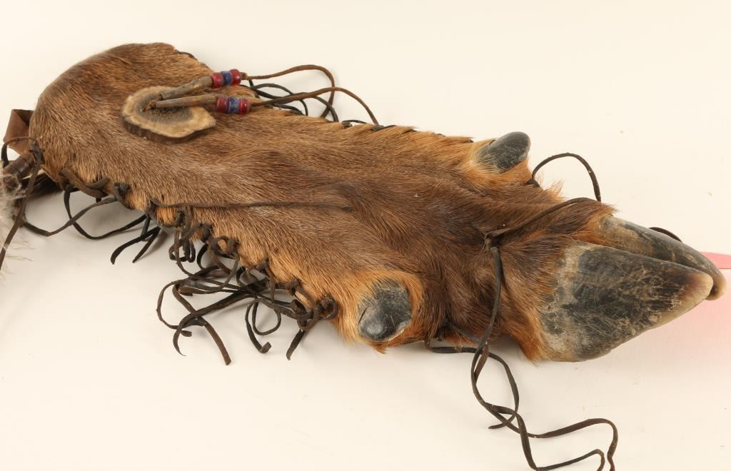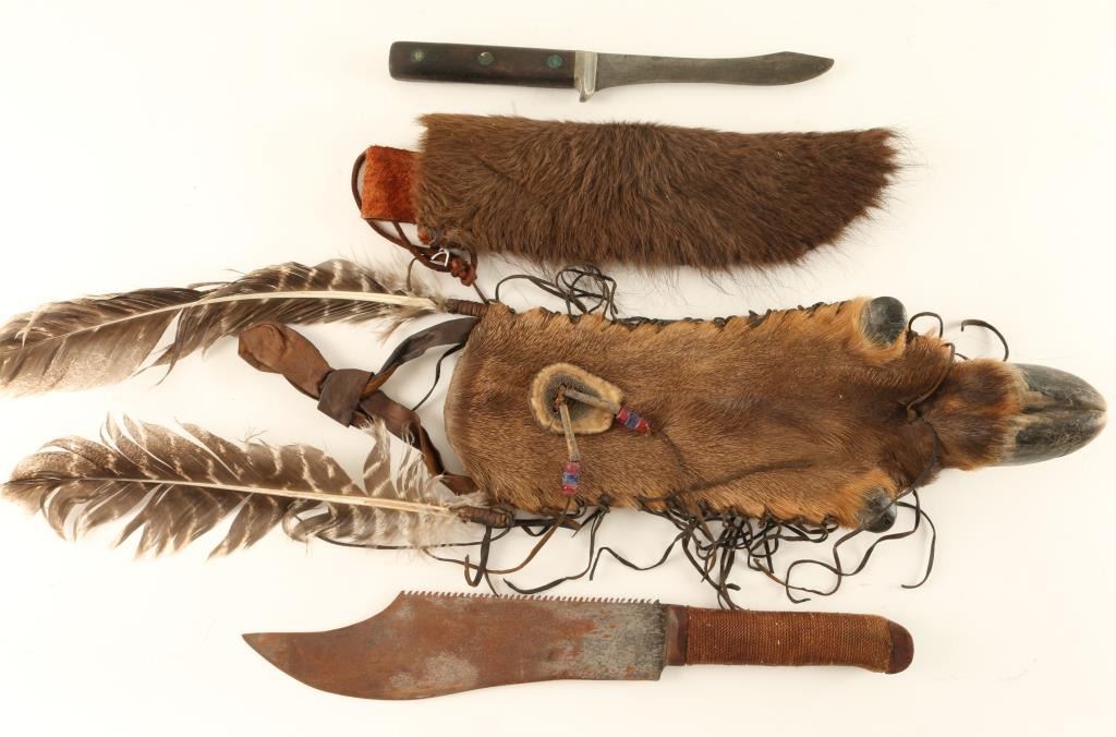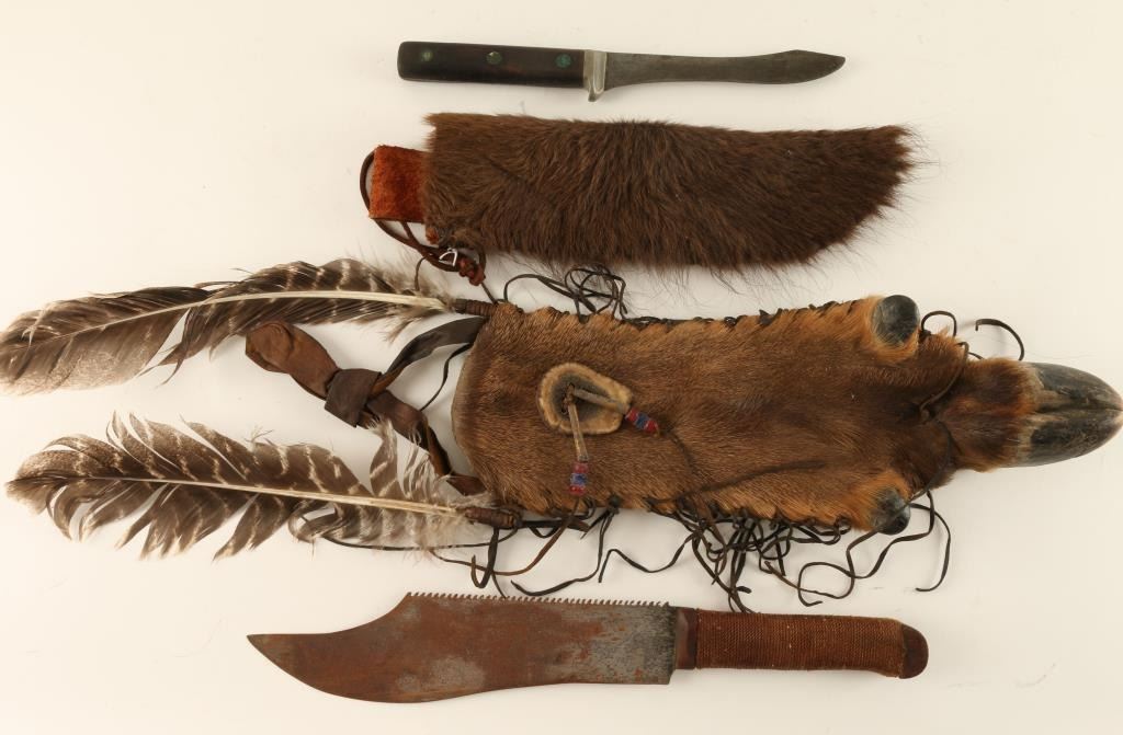 Reproductions, 1 serrated knife with twine wrapped handle in an elk's foot pouch accented with beads, antler, fringe and feathers and 1 buffalo sheath with wooden handled knife.