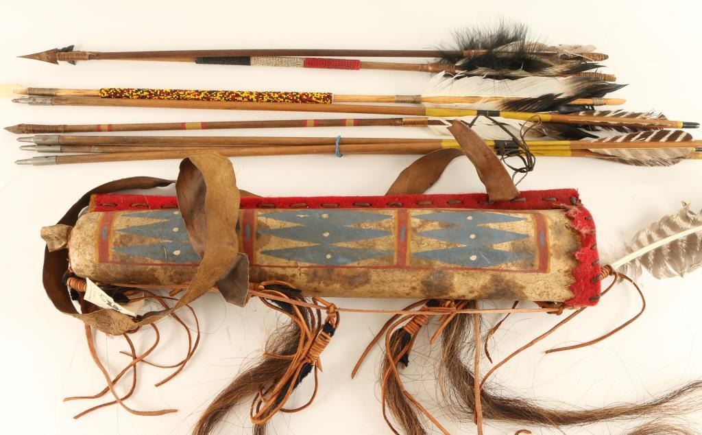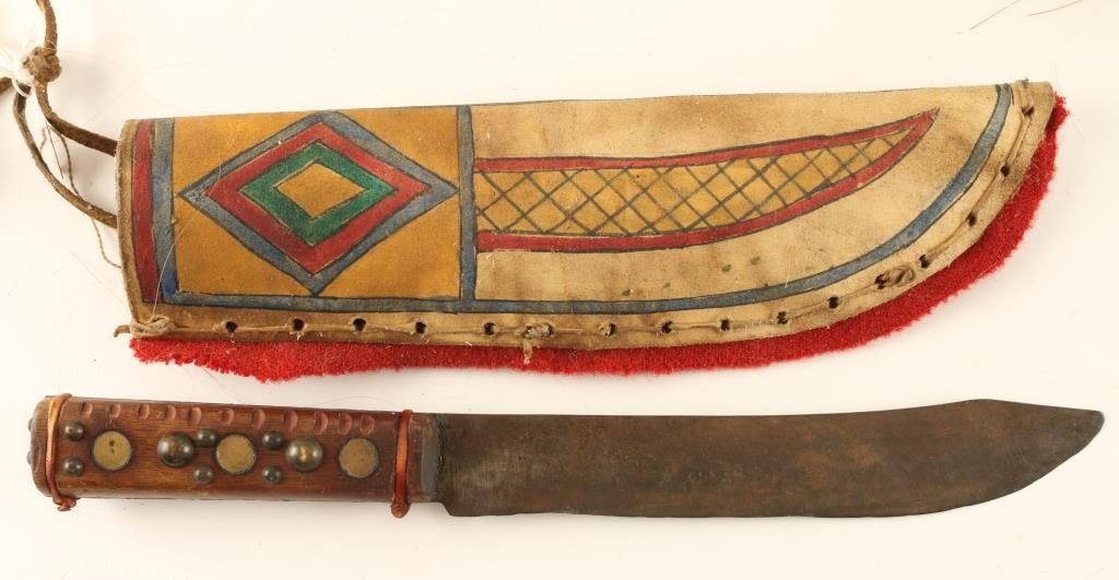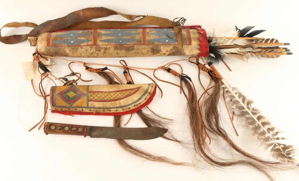 1 Plains Indian bow & arrow set. Earth painted rawhide with buckskin, feathers, trade cloth and horsehair. Leather sling has come off bottom part of quiver. 1 painted rawhide knife sheath accented with trade cloth and wood handled knife with brass spotted design. 12 1/4" overall with a 7 3/4" blade marked 'Stewarts Hand Made'.