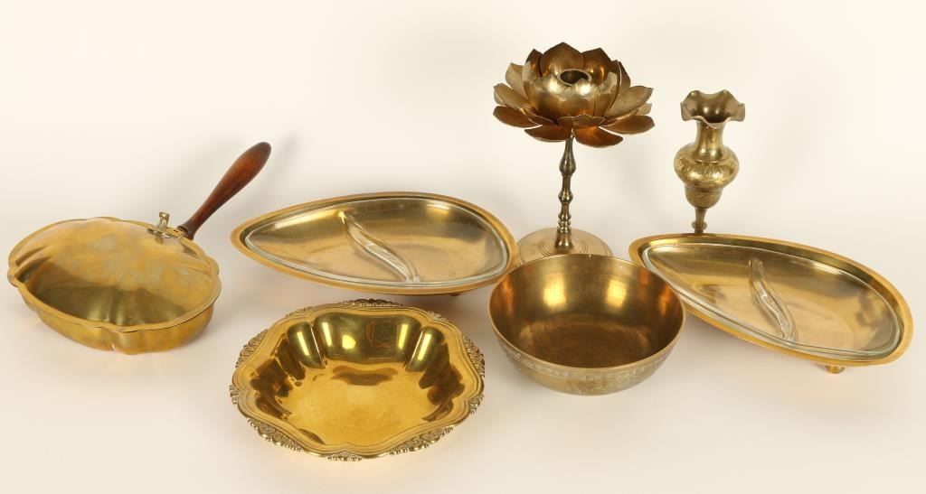 1 dish with scrolled edges, 2 kidney shaped dishes with glass inserts, 1 bowl with etched floral design and 1 clamshell with lid and wooden handle. Also included are 2 candlestick holders.