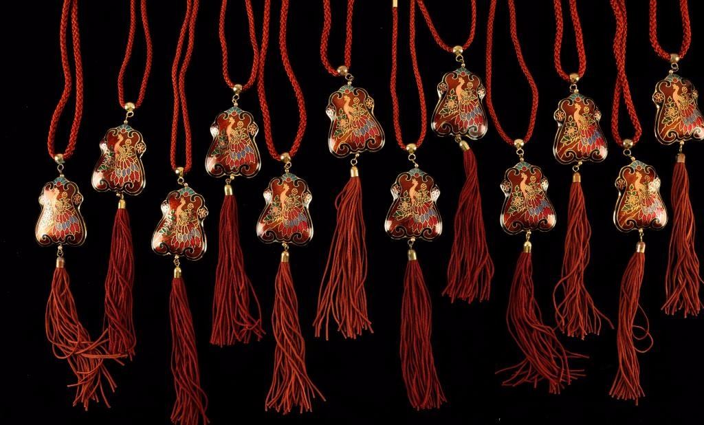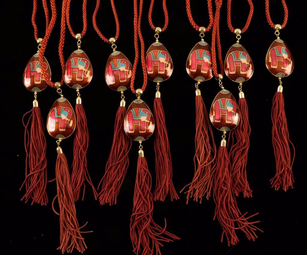 Asian Cloisonne pendant necklaces with an elephant and peacock design, accented with dangling tassel on woven cord.