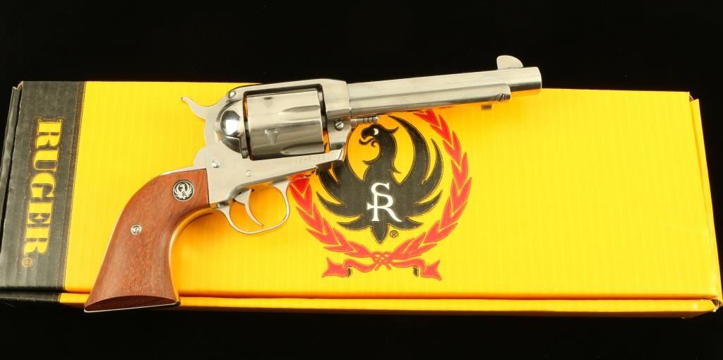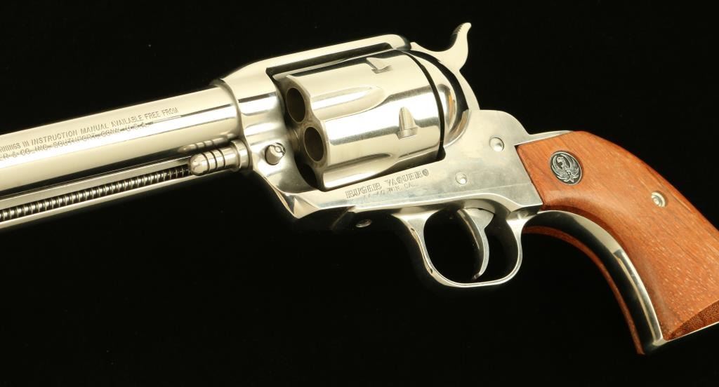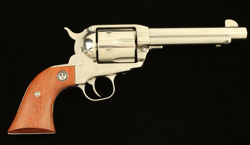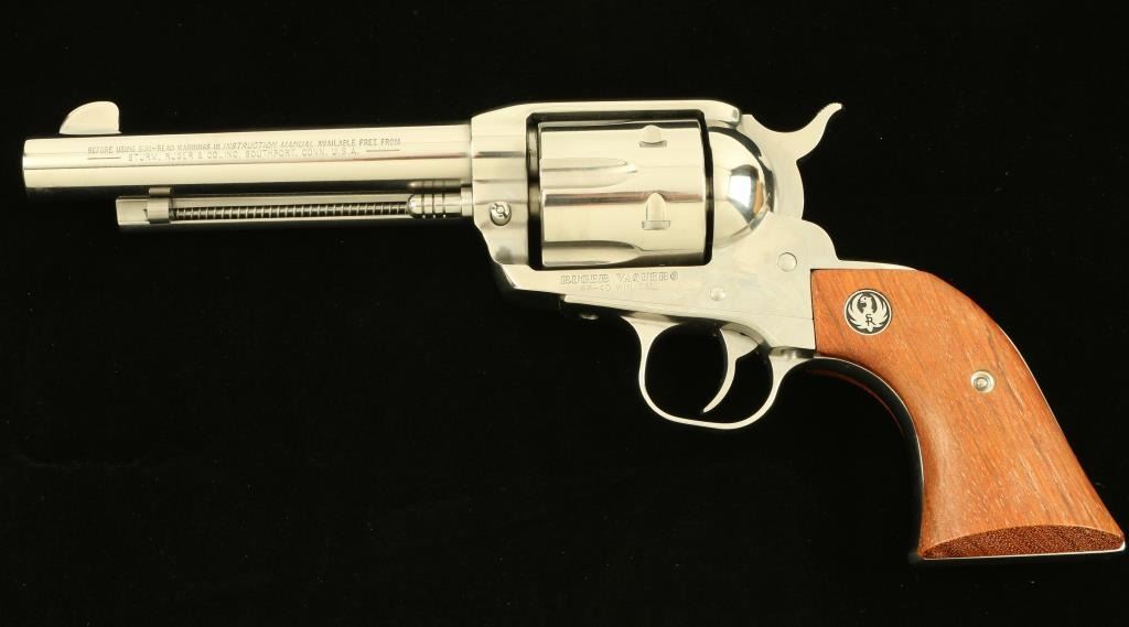 Stainless steel single action revolver chambered in .44-40 Winchester, circa 1994. Features a polished finish, 5.5" barrel, blade front sight, notched rear sight, fluted six shot cylinder, ejector rod, transfer bar safety, smooth trigger, serrated hammer spur, and Ruger medallion two piece smooth wood grips. Includes original factory box with document. Revolver's finish shows only a faint drag line. Action is smooth, bore is pristine and wood grips are fine. Condition is like new in box. ***Modern Firearm***