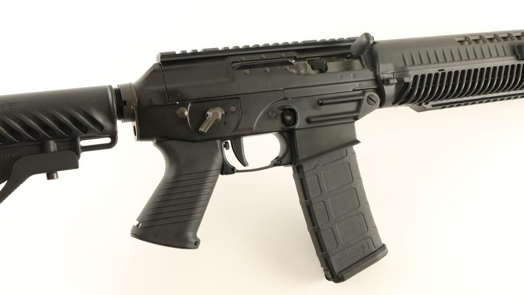 Quality semi-automatic rifle modeled after the Swiss SG 550 and chambered in 5.56x45mm. Features a matte black finish, 16" barrel with flash suppressor, no sights, scope mount, tri-rail handguard, ambidextrous safety selector, push button magazine release, 30 round Pmag magazine, adjustable trigger, serrated pistol grip and three position shoulder collapsible shoulder stock. Includes a black plastic hard case with manual and extra magazine. Rifle shows light wear from handling and use with scrapes by ejection port and some visible wear on scope rail. Action is solid, bore is pristine and stocks are fine. Condition is very good++. ***Modern Firearm***