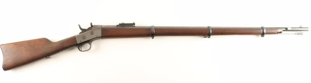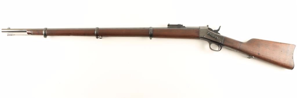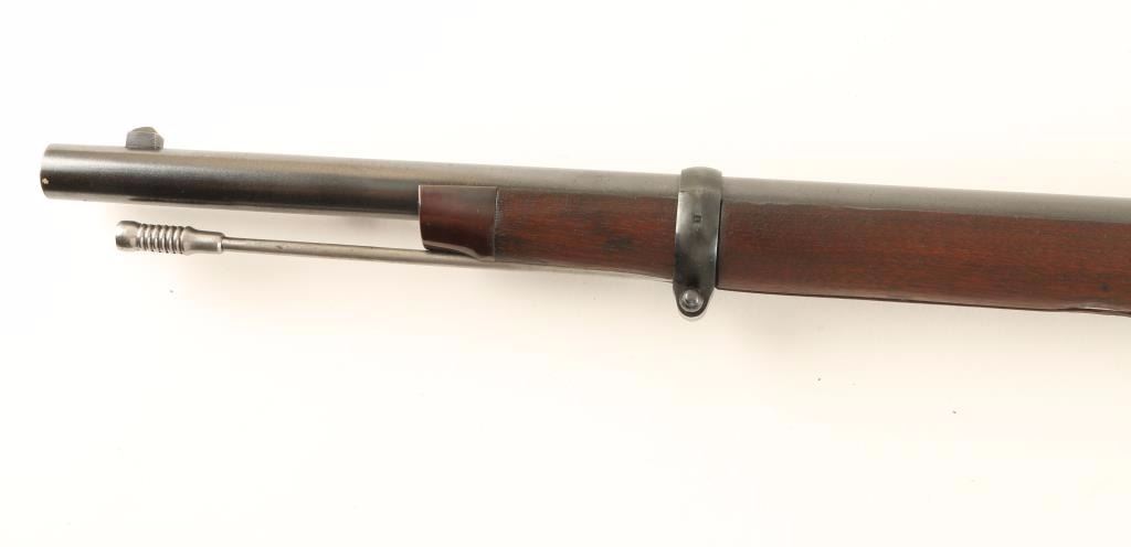 'Model 1879' Argentinean military single shot rolling block rifle chambered in 11.15x58Rmm. Features a blued refinish, 36" partially-octagonal barrel with integral bayonet lug, blade front sight, graduated rear sight, three barrel bands, steel cleaning rod, smooth trigger, checkered hammer & breech lock spurs, sling swivels, full length wood forend and straight grip shoulder stock with metal buttplate. Marking on tang are faint & illegible with no other visible marking on the rest of the rifle other that "U" stamped on each barrel bands. Rifle exhibits approximately 80% of it's blued refinish with receiver showing most of the loss. Action is sound, bore is pristine and wood stocks are good. Condition is very good as refinished. ***Antique Firearm***