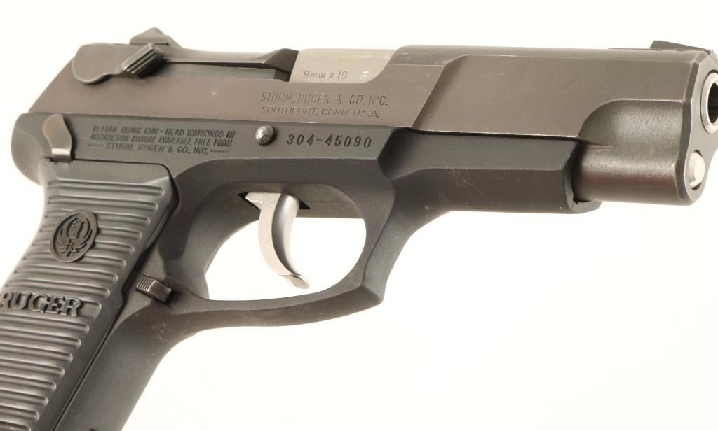 Double action semi-automatic pistol chambered in 9x19mm. Features a black finish, 4.5" barrel, adjustable three dot sights, ambidextrous decocker/safety, smooth trigger, serrated hammer spur, matte black aluminum frame, push button magazine release, 15 round magazine, lanyard loop, and grooved Ruger black polycarbonate grips. Includes a red factory hard case. Pistol shows very light edge wear and few light scratches. Action is smooth, bore is excellent and grips are fine. Condition is very good. ***Modern Firearm***