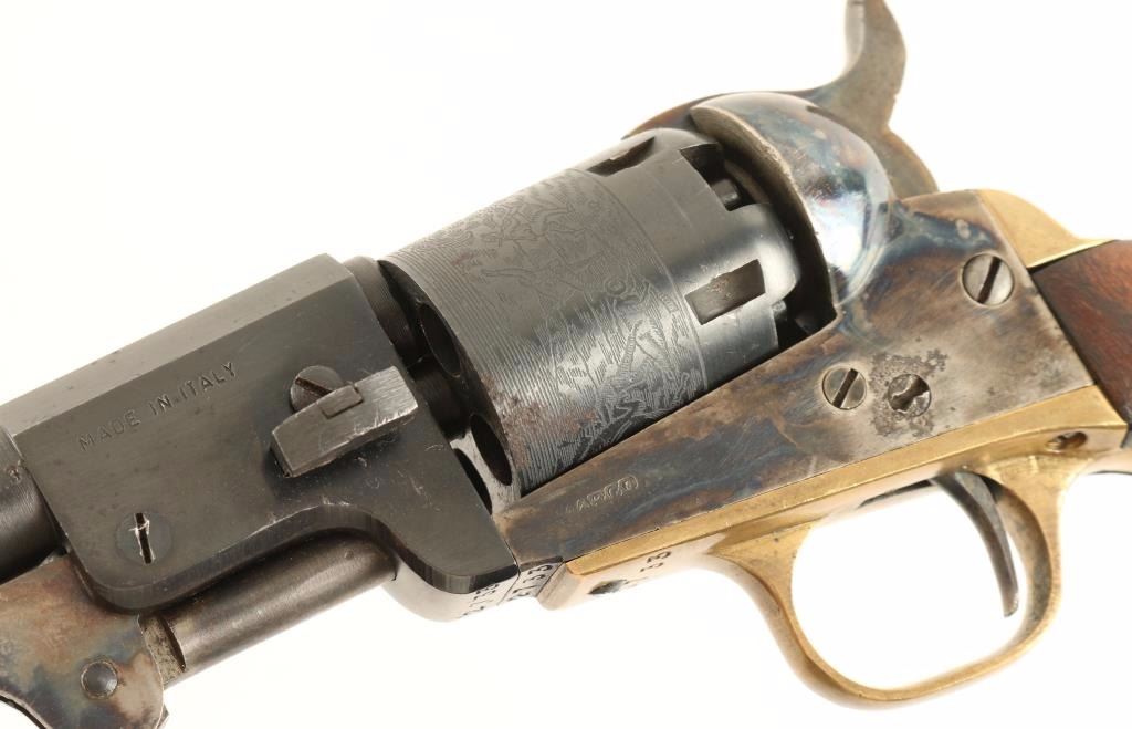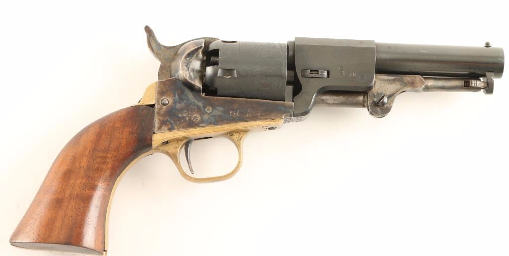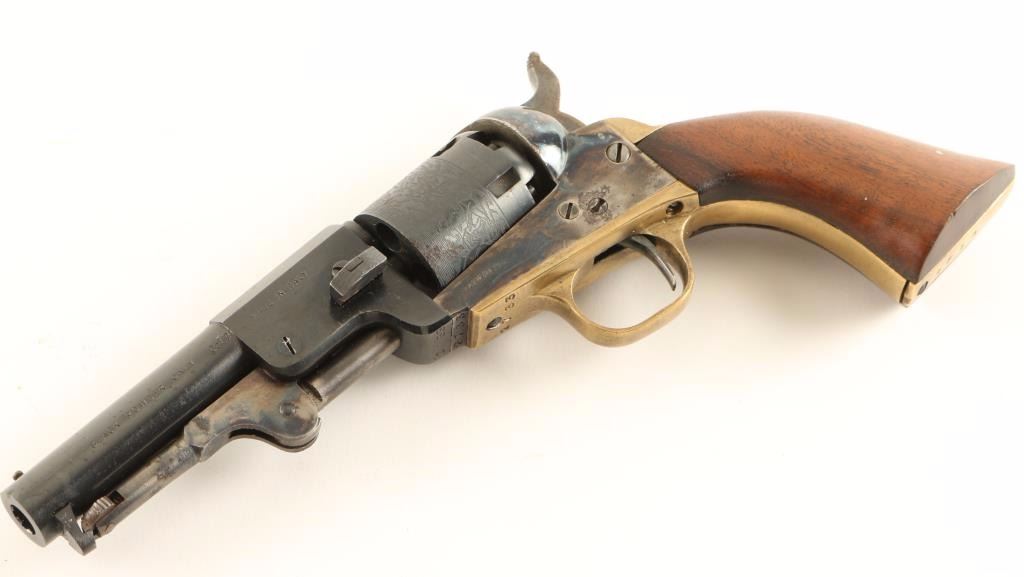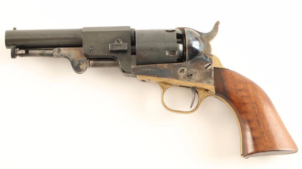 Replica black powder percussion 5-shot pistol. Short frame with 4" Dragoon barrel. Engraved cylinder. Color case hardened frame, hammer, trigger and loading lever. Brass trigger guard and backstrap. Some areas of surface rust and pitting with some scratches on the barrel. Condition is good. *Antique Firearm*