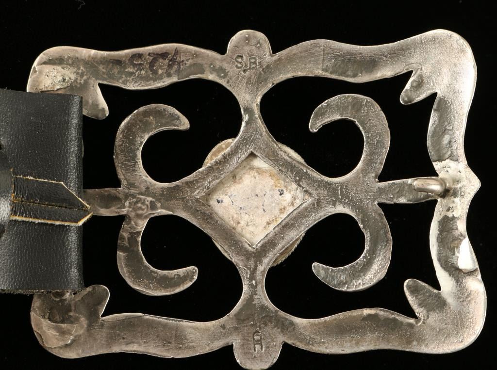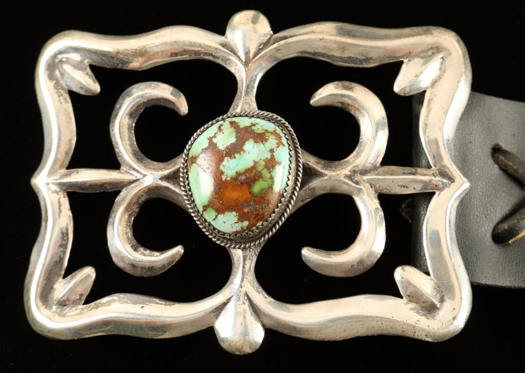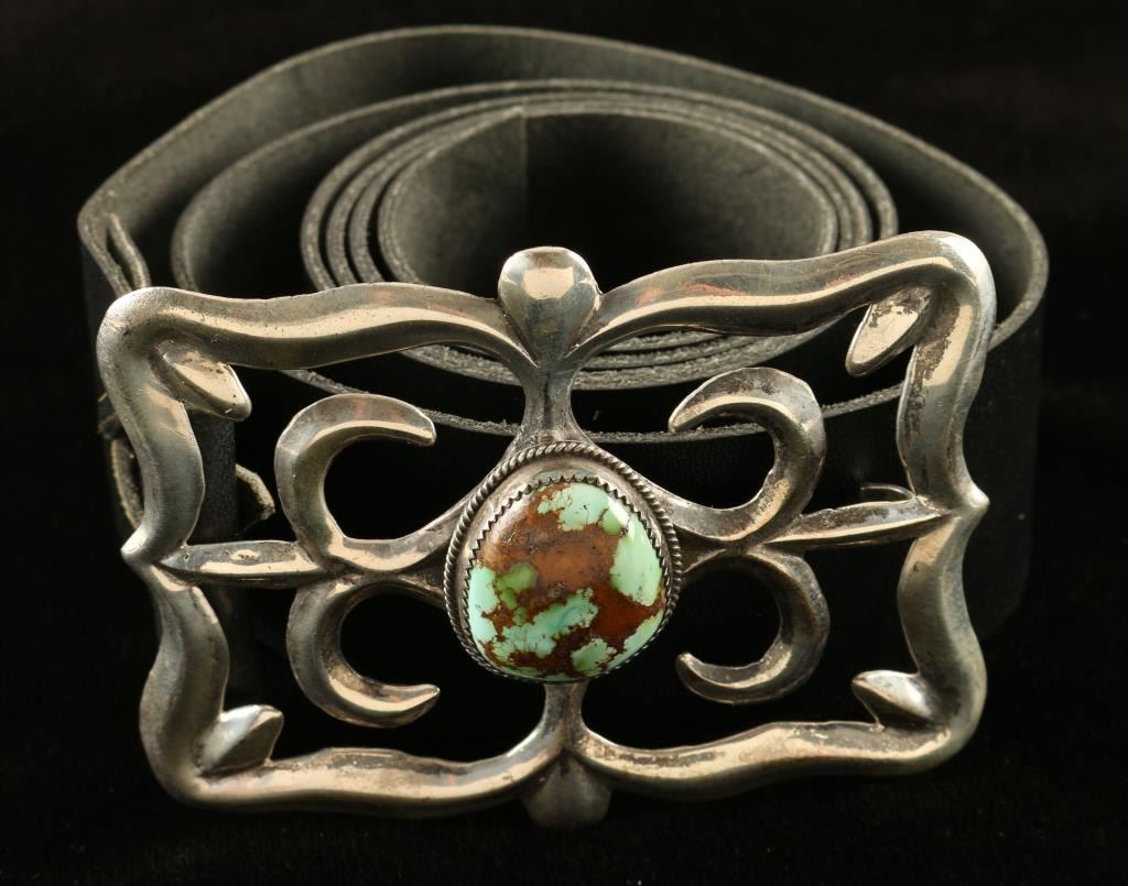 Large center green turquoise cab. Stamped 'SB' solid sterling silver construction on smooth black leather belt size 36. Retail $550.