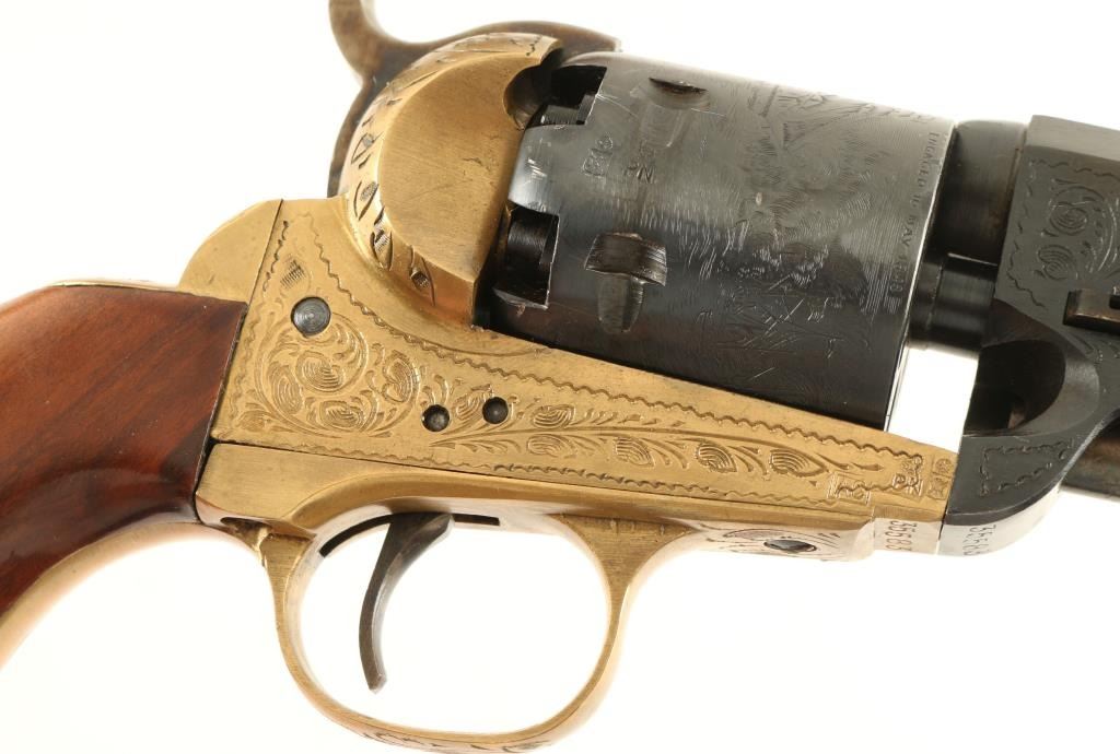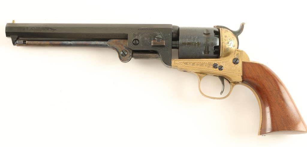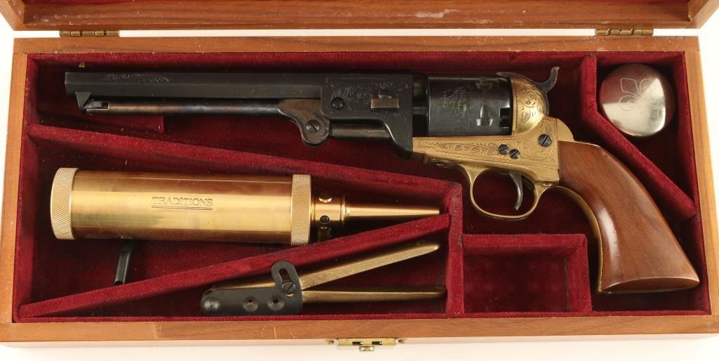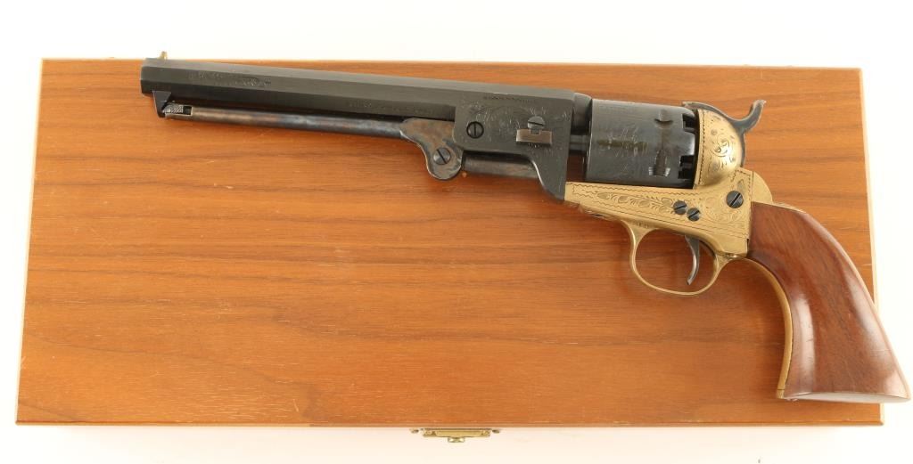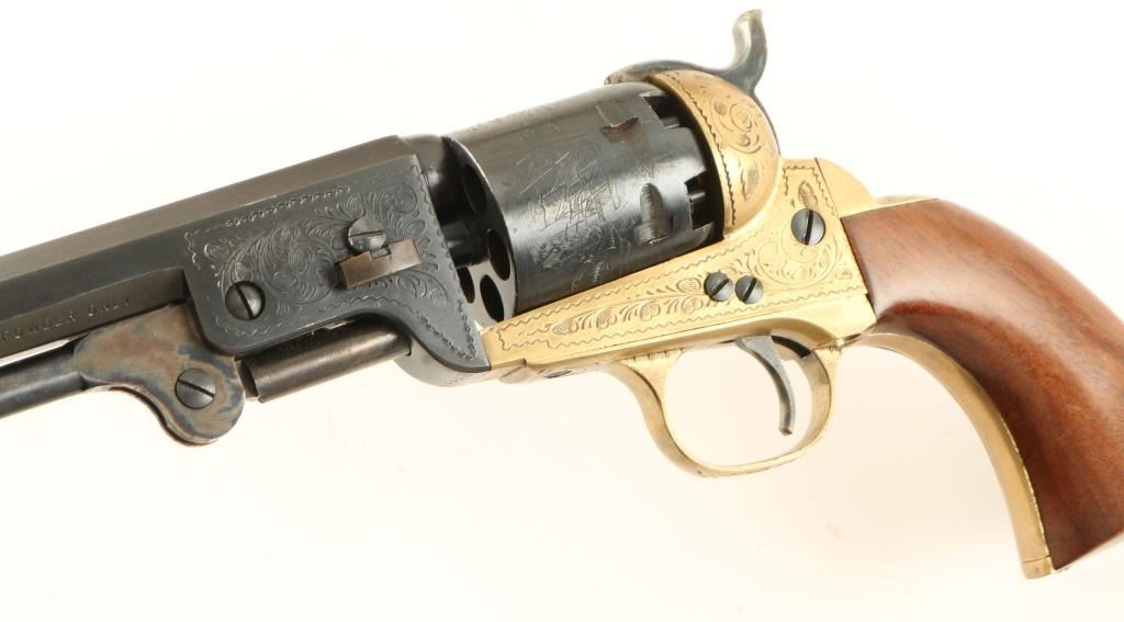 Cased engraved replica black powder single action 6-shot percussion pistol. Blued 7-1/2" octagon barrel. Case colored loading lever, hammer and trigger. Blued and roll-stamped cylinder showing a naval engagement. Brass frame, trigger guard and backstrap. Not cut for a shoulder stock. Lined hardwood case with loading and maintenance tools. Condition is like new in box. *Antique Firearm*