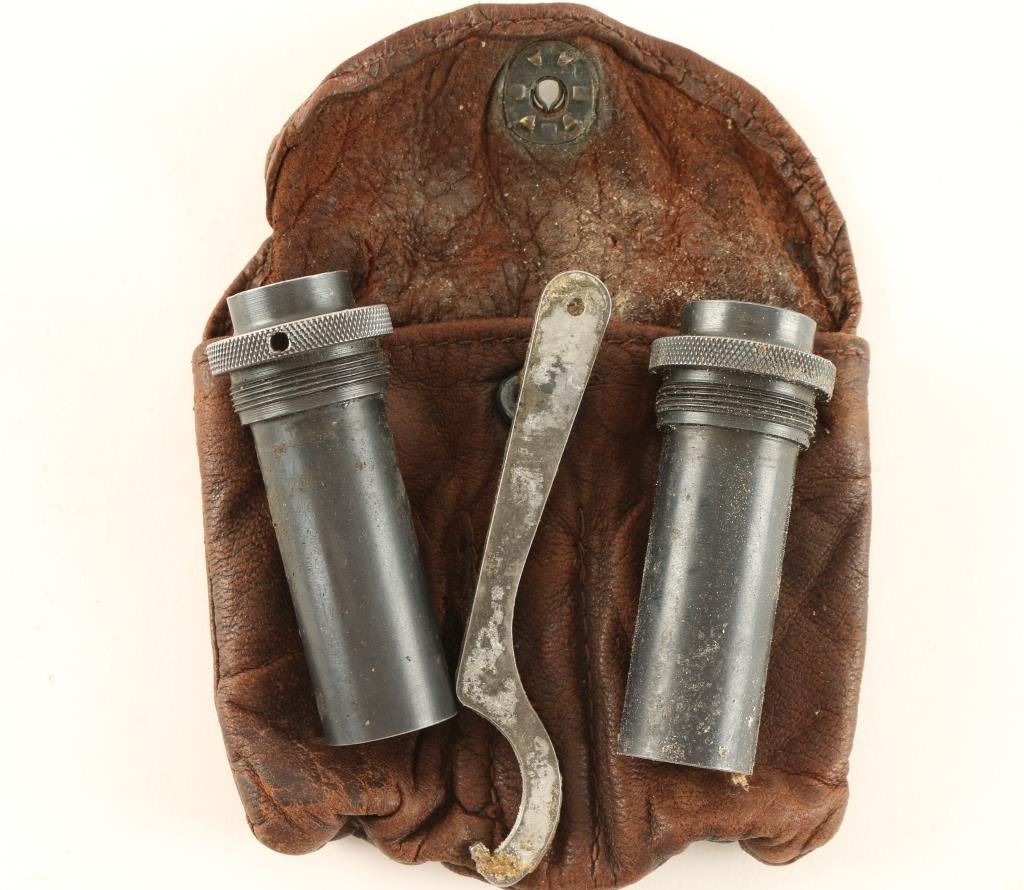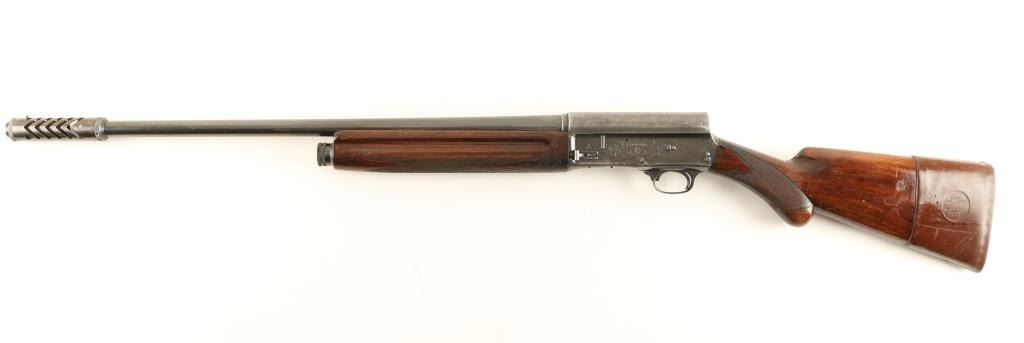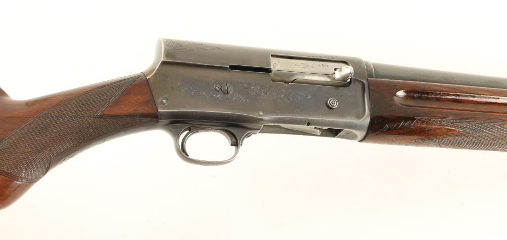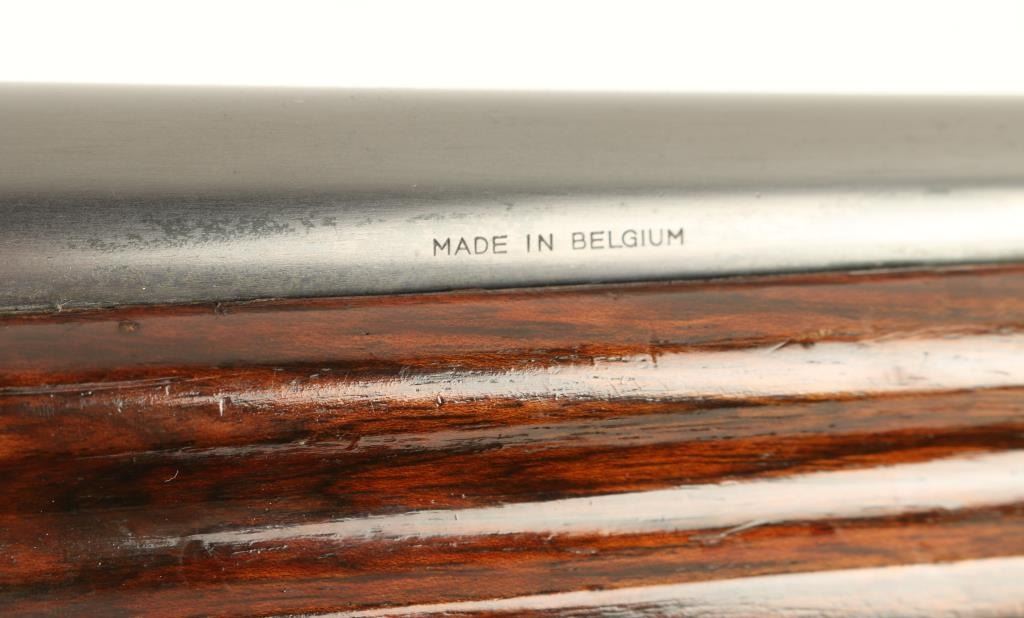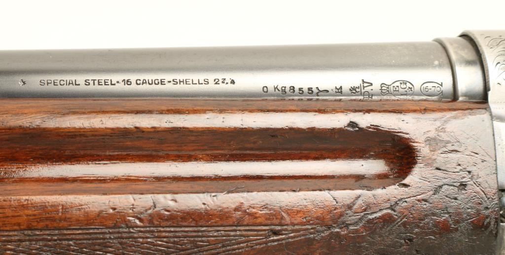 'Grade I' Belgium made semi-automatic shotgun chambered for 2 3/4" 16 gauge shells. Features a blued finish, 22.5" barrel with St. Louis Mo marking, Power Pac choke with brass bead sight, sliding safety, smooth trigger scroll engraved receiver, polished bolt with checkered charging handle, checkered wood forend and pistol grip shoulder stock with round knob & slip over recoil pad. Includes a brown leather belt loop pouch that contains short and long range chokes with a choke wrench. Shotgun exhibits approximately 70% of it's original blued finish with moderate wear and few small spots of dark rust on receiver. Stocks have been refinished to a high gloss sheen and some varnish is evident on the tang. Action is crisp, bore is excellent and wood stocks are near good with considerable mars to the forend. Condition is good to very good as modified. ***Modern Firearm***