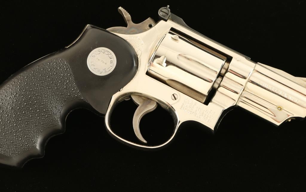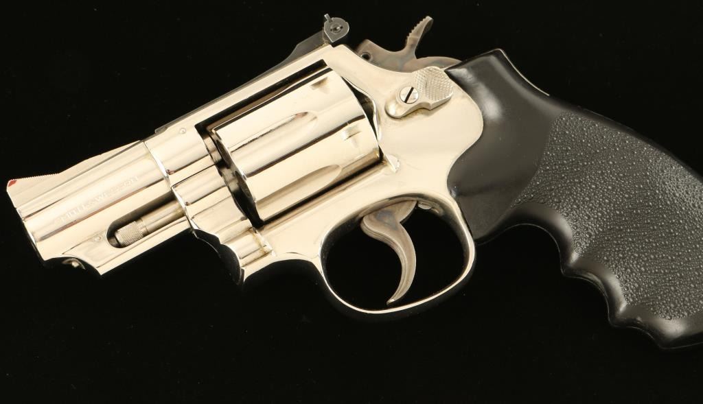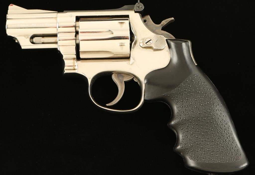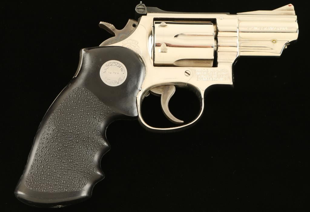 Nickel plated large frame double action revolver chambered in .357 Magnum. Features a polished finish, 2.5" barrel with underlug, ramped front sight, micrometer click rear sight, fluted six-shot cylinder, serrated backstrap, case hardened hammer & serrated trigger, and black pebbled hard rubber Hogue Monogrip. Revolver shows light handling wear with few scratches and retains a bight finish. Action is smooth, bore is pristine and grip is fine. Condition is near excellent. ***Modern Firearm***