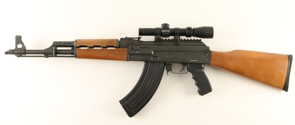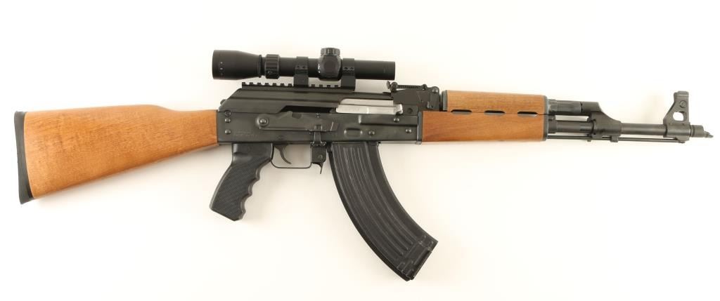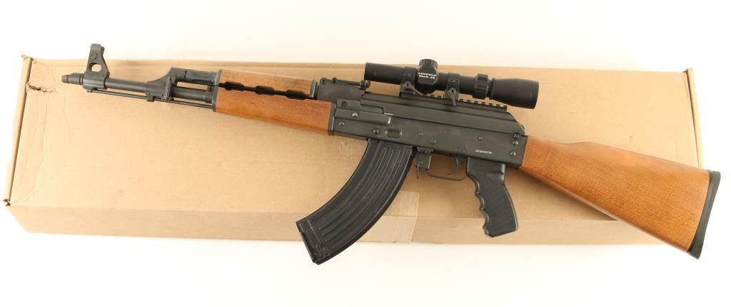 Serbian made AK platform semi-automatic rifle chambered in 7.62x39mm. Features a blued finish, 16.5" barrel with slant muzzle break, shrouded front sight, adjustable rear graduated sight, top mounted Leupold MK-AR 1.5-4x 20mm scope, cleaning rod, sling points, 30 round magazine, safety selector switch, Tapco trigger, checkered black synthetic pistol grip, and wood furniture. Rifle shows very little handing wear with a few small scratches. Action is sound, bore is mirror bright, and stocks are fine. Condition is excellent+. ***Modern Firearm***