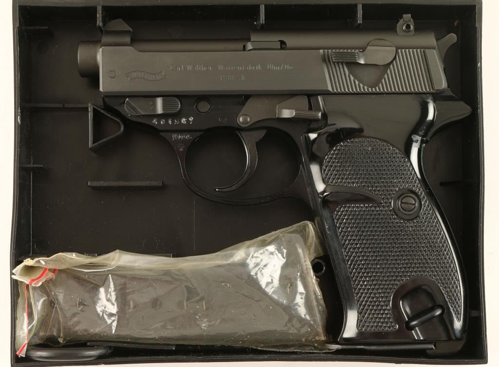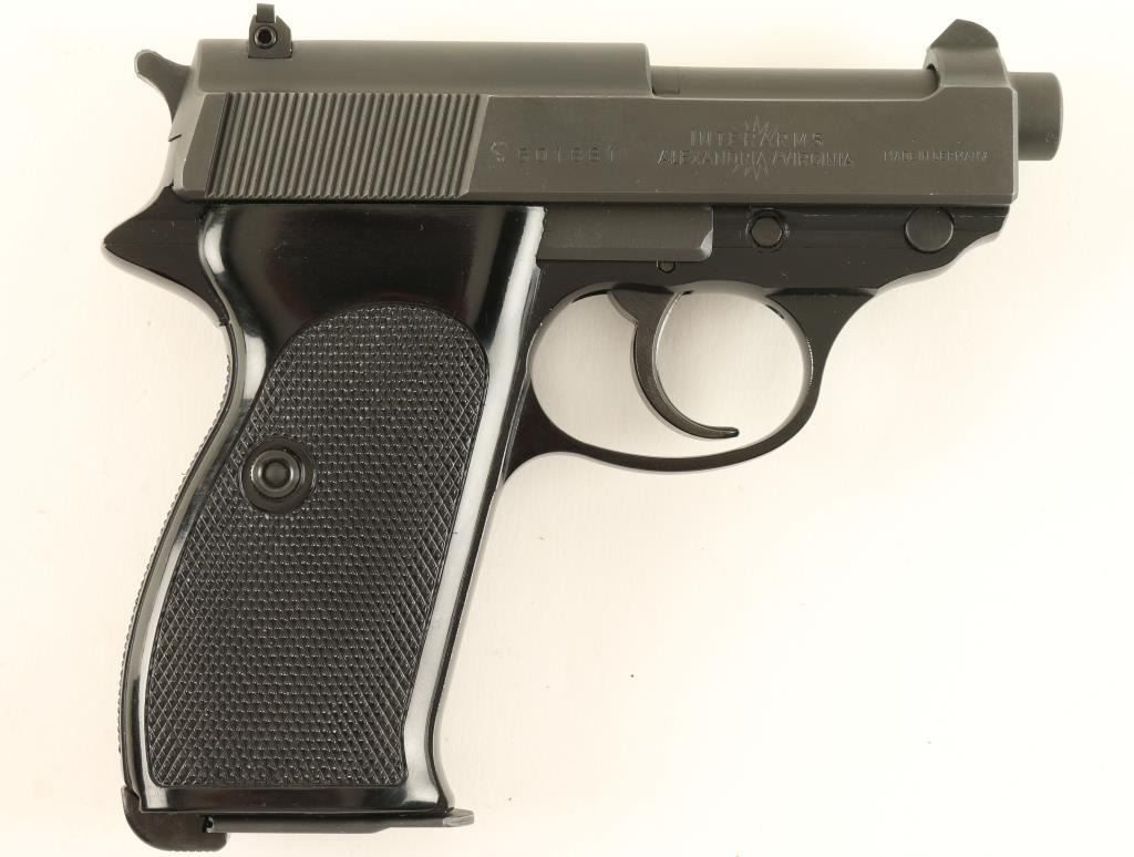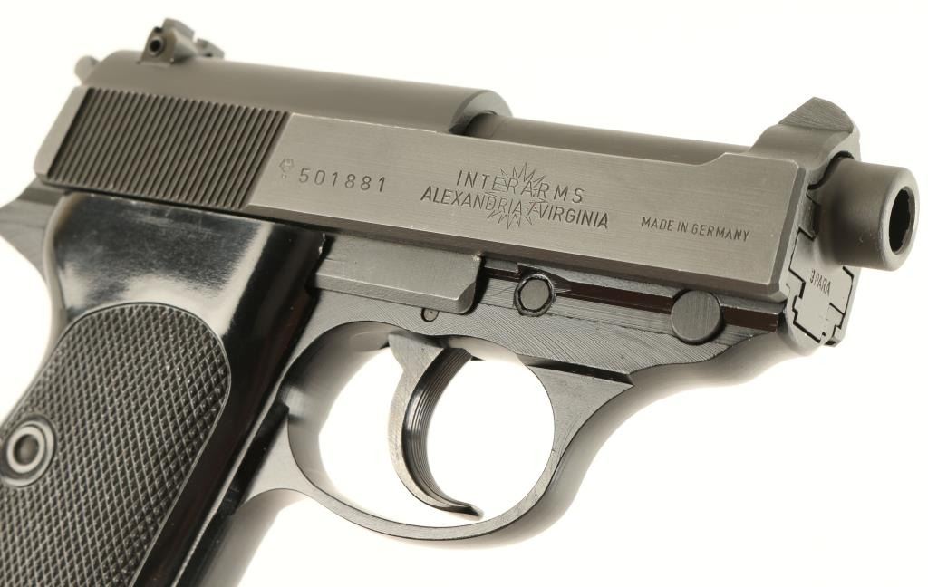 Scarce German made short-barreled semi-automatic pistol chambered in 9mm Luger, imported by Interarms. Features a matte finish, 2 3/4" barrel, serrated slide with integral front sight, adjustable rear window sight, thumb decocker, serrated trigger & hammer spur, lanyard loop, 8 round magazine and two piece black checkered wrap around grips. Includes factory hard case with documents and extra magazine. Pistol shows little to no wear. Action is crisp, bore is pristine and grips are fine. Condition is like new in case. ***Modern Firearm***