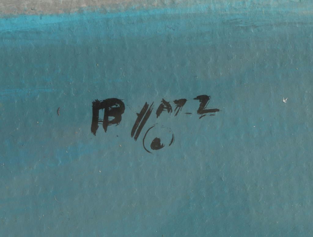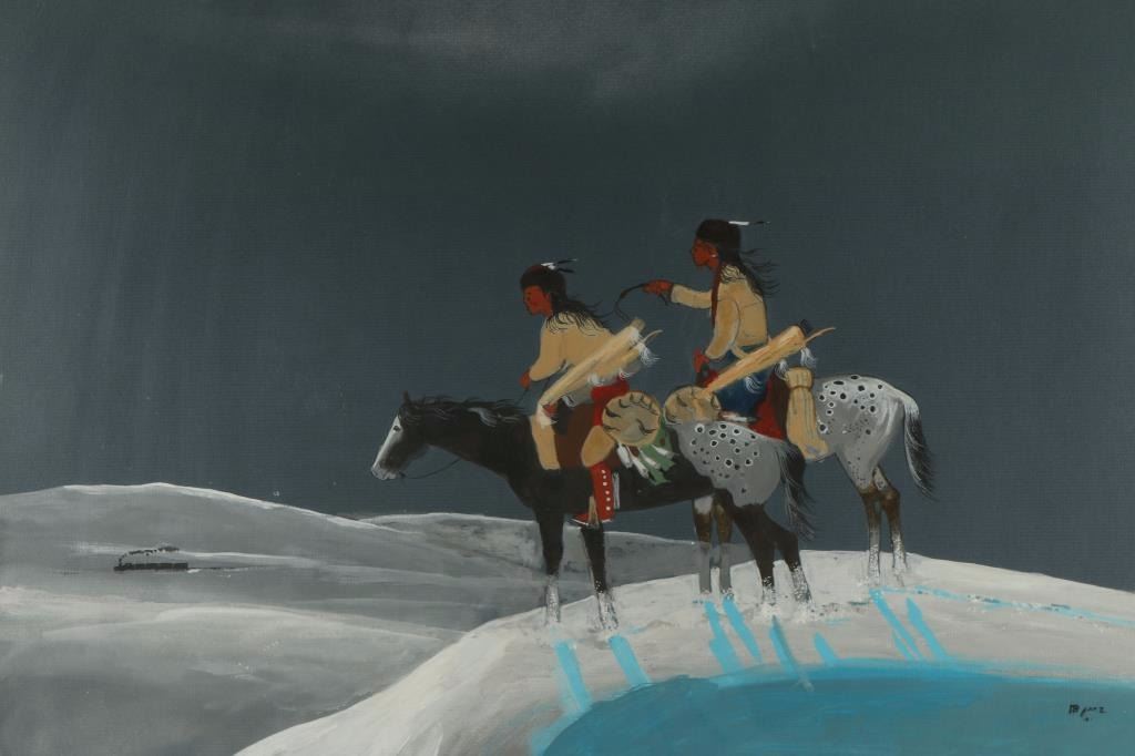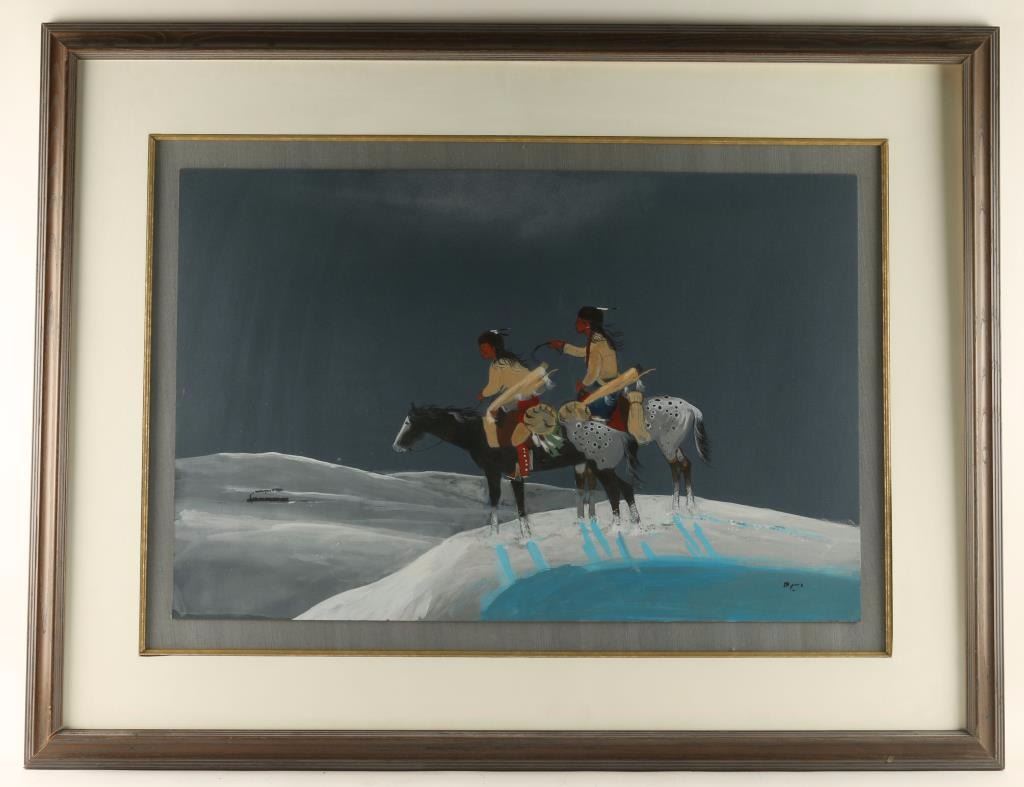 Depicting 2 Indians on horseback on a snowy hill side pointing down towards a train, by well known artist Beatin Yazz, signed lower right. Image measures 30"x20", single mat with wood frame. From AskArt.com- "Several books are based on his life and career, and he has been featured in numerous publications. He has won awards at every major showing of Indian art throughout the United States. The artist was drawing and writing with crayons at eight years of age. Sallie and Bill Lippencot, operators of Wide Ruins Trading Post, influenced him most by recognizing and encouraging his talents. While still a student, he sometimes worked in oils from a model. Today Beatin prefers to paint animals and people, not landscapes, in the casein medium. (Jeanne Snodgrass, "American Indian Painters).