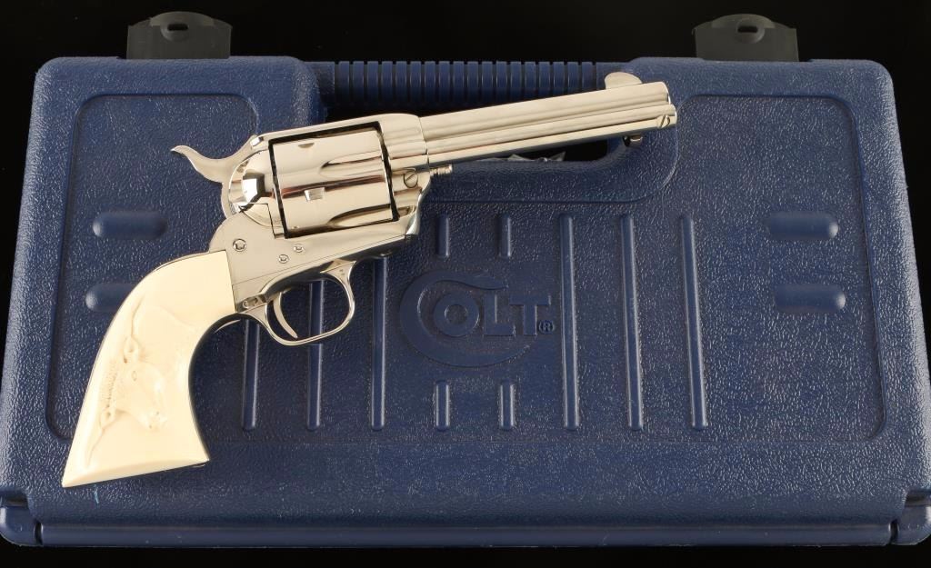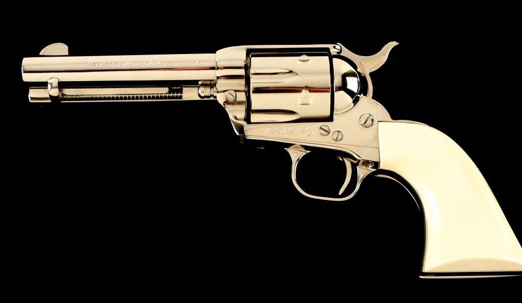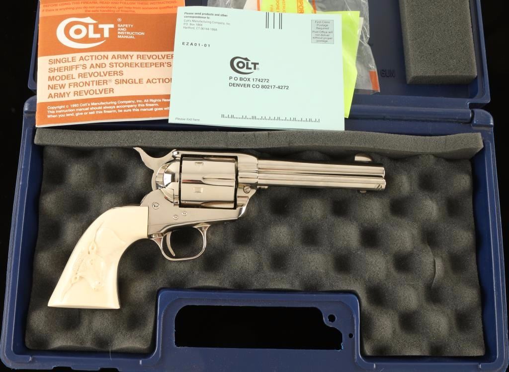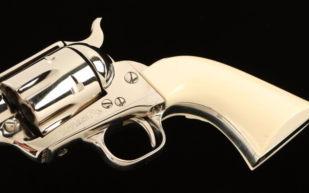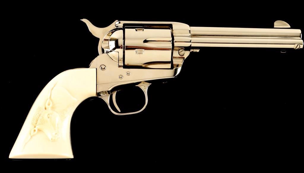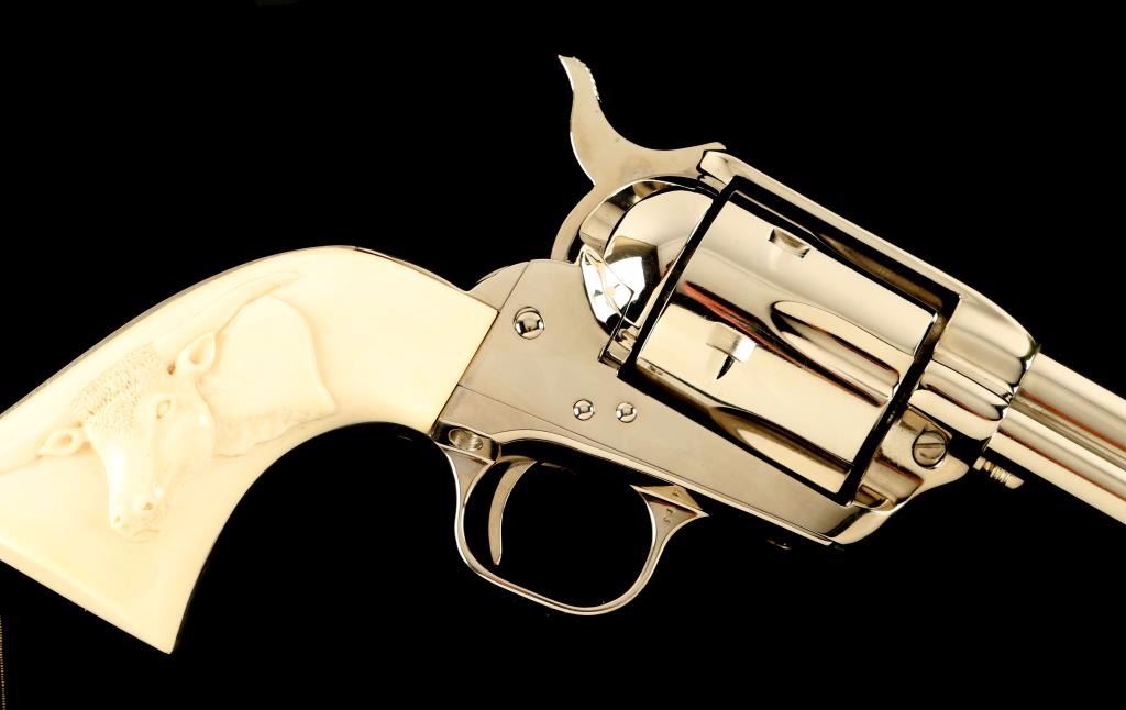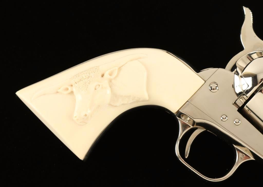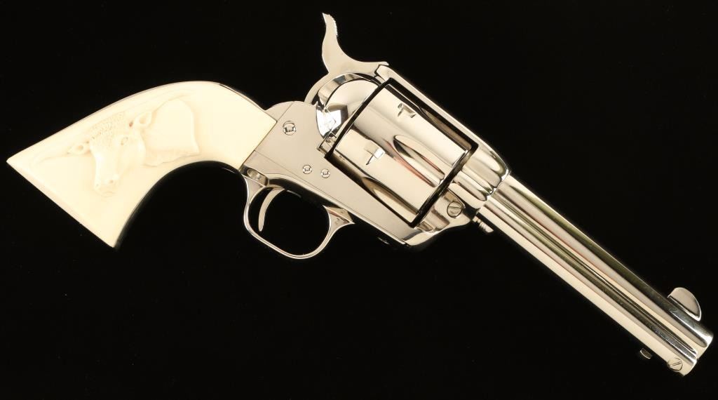 'Third Generation' Single action revolver chambered in .44 Special, circa 1979. Features a polished nickel finish, 5 1/2" barrel, blade front sight , notched rear sight, ejector rod, fluted six-shot cylinder, checkered hammer spur and custom two piece ivory grips with finely carved steer head in right grip panel. Includes a factory hard case with documents. Revolver remains in a beautiful 98%+ condition with little to no visible wear except a single scratch on the hammer. Action is smooth, bore is pristine and grips are extra fine. Condition is excellent++. ***Modern Firearm***